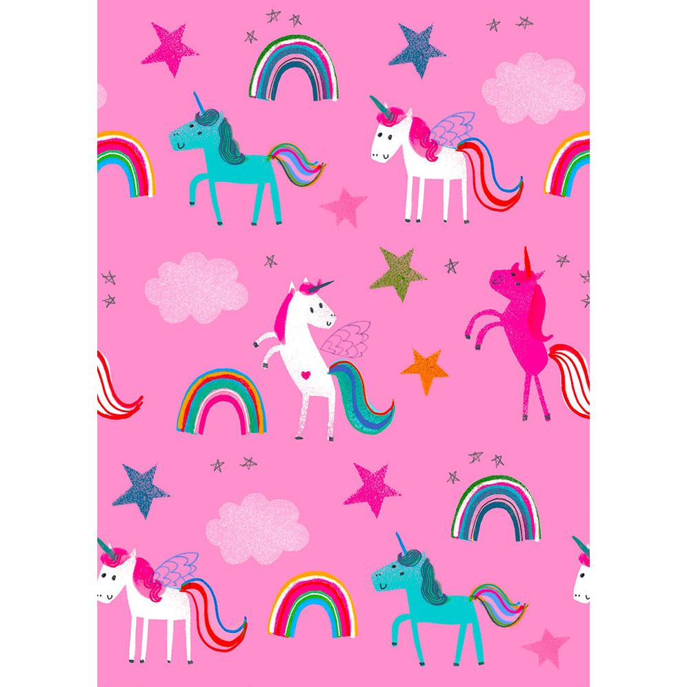 If you have a kid or whimsical adult in your life. you’ll need this paper for their next gift. Silly multi-colored unicorns prance among stars. clouds. and rainbows. all against a pink background. Printed on heavyweight paper. the wrap sheet measures 27L x 20 W.