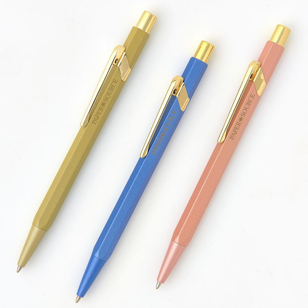 Paper Source Collection pastel metallic clip ballpoint pen set. Features 3 pens with black ink.