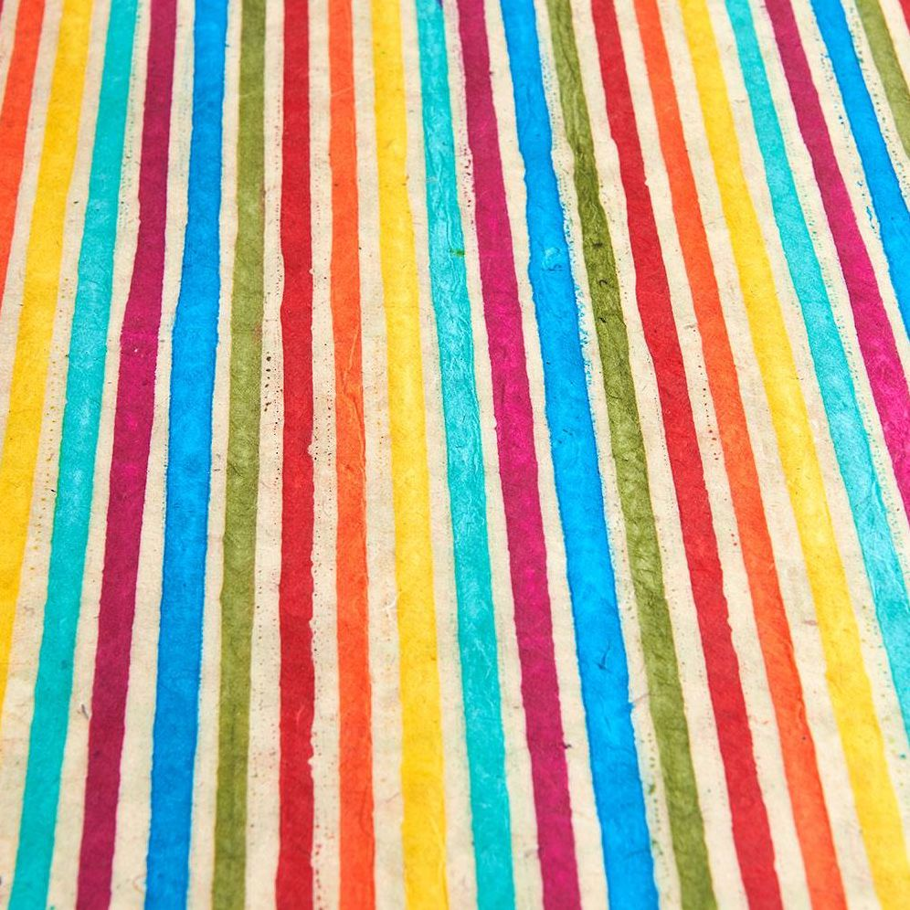 Add some vibrancy to your wrapping with this dynamic rainbow striped Lokta fine paper. The renewable Lokta plant’s long fibers are remarkably strong. giving Lokta paper its durability. supple feel and beautiful aesthetic. These qualities make this lovely fine paper suitable for bookbinding. gift wrapping. or card making. And because the Lokta plant is renewable. these handmade papers are truly a green choice.