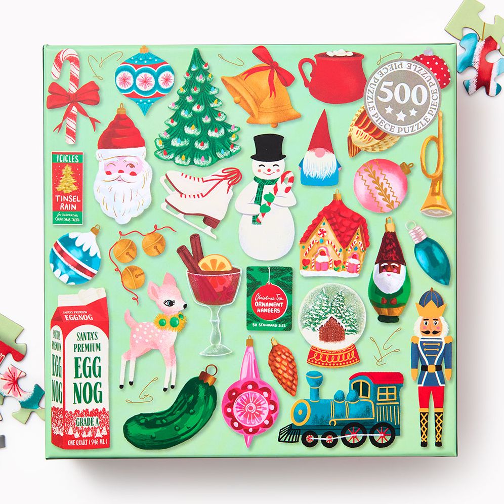VINTAGE CHRISTMAS CHARM ?C Step back in time with this nostalgic holiday puzzle featuring a delightful collection of classic Christmas ornaments. From Santa and nutcrackers to gingerbread houses and shimmering baubles. every piece captures the warmth and joy of a vintage holiday.