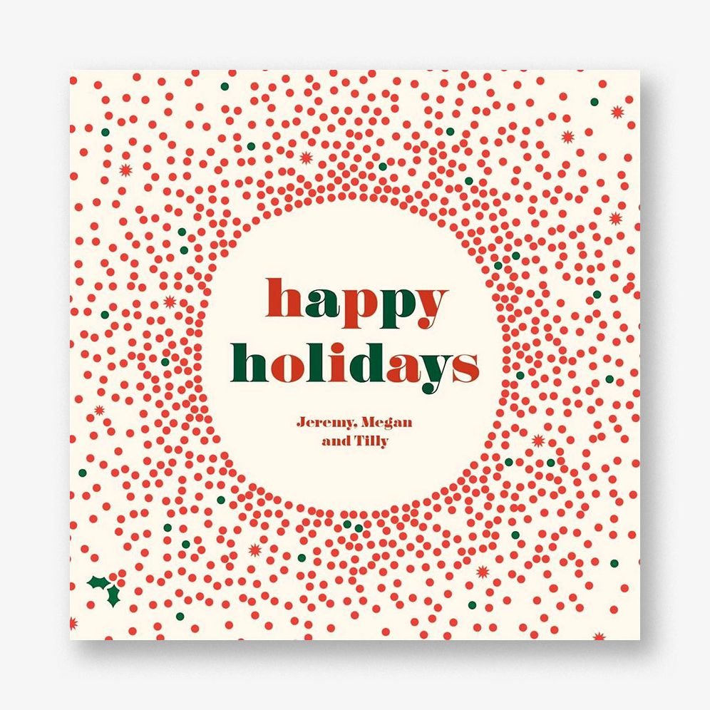 This cheery holiday card. designed by Cheree Berry for Paperless Post. features a mod-style dotwork pattern in classic holiday colors to wish your loved ones seasonal greetings with retro flair.