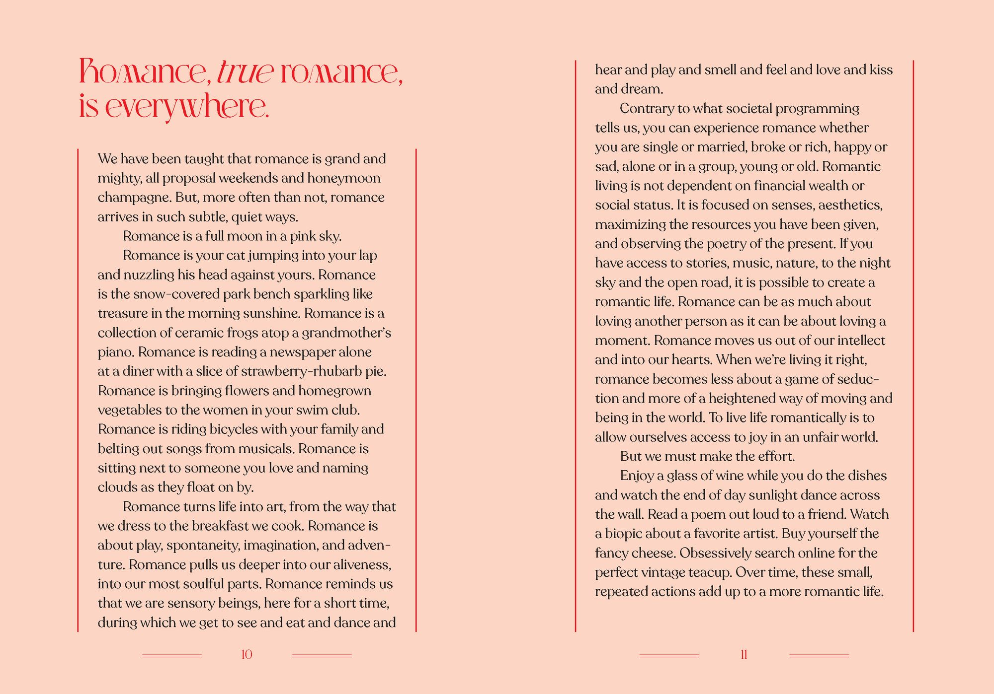 Romantic living is not dependent on financial wealth or social status. It is focused on senses. aesthetics. maximizing your resources. and observing the poetry of the present. The perfect gift for someone you love or self-purchase to honor the love in your heart. Romance the Every Day is for anyone seeking to add a bit of optimistic (and delightfully romantic) texture to their life.