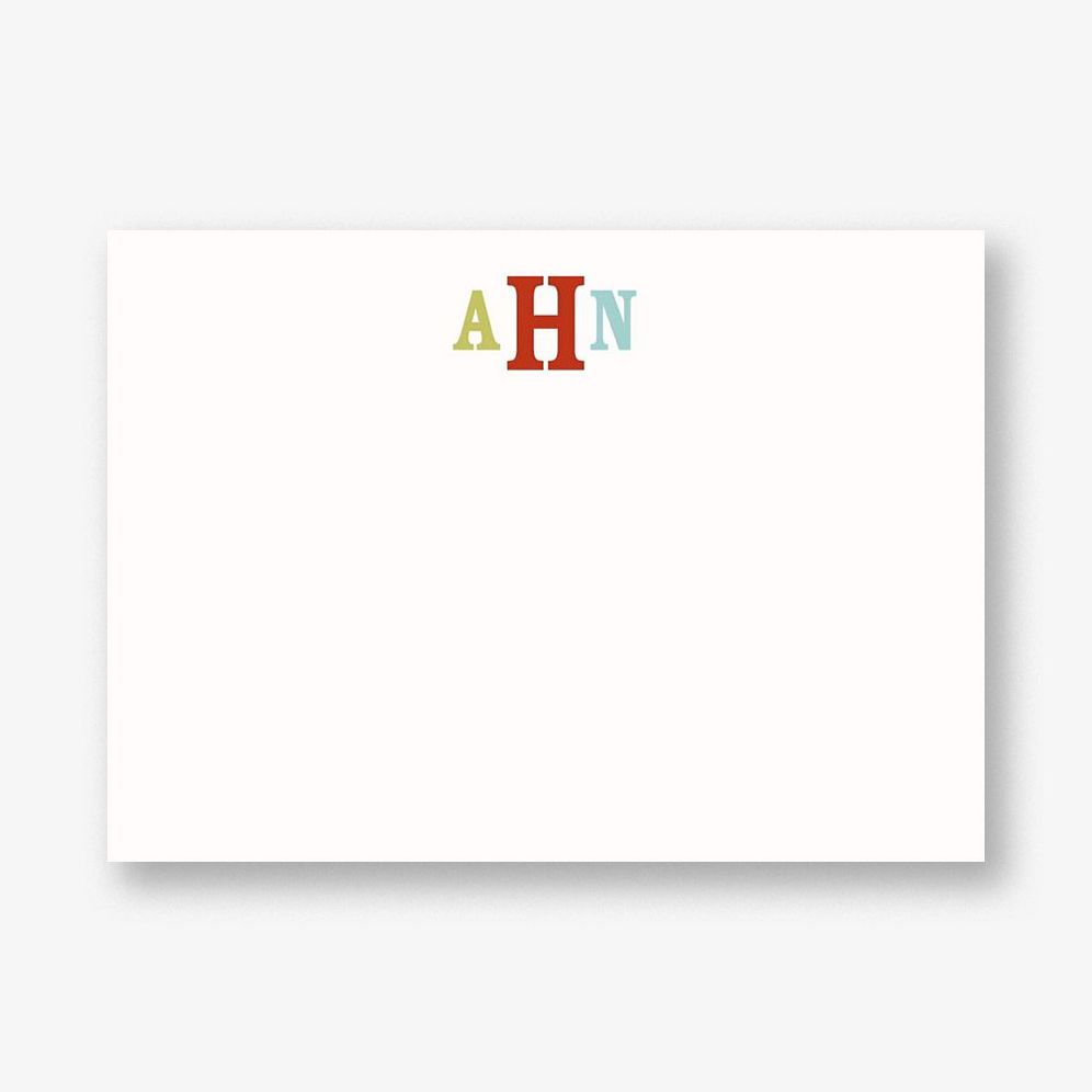 Choose three favorite colors to highlight your monogram with this fun stationery design. Printed on superfine white paper. which has a smooth finish and is soft to the touch. 130# cover weight paper with 30% post consumer recycled content.