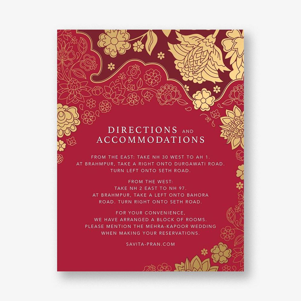 Opulent golden flowers and rich hues bring your day-of details into focus on the Sanganeri Foil Information Card. designed by Paperless Post.