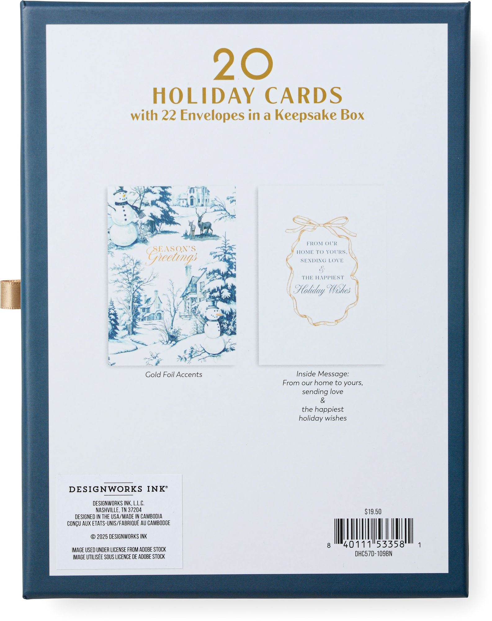 Share the spirit of the season with some nostalgia from the past. These cards feature a traditional snowy countryside with the charm of a playful snowman translated into a beautiful toile pattern. The set contains twenty 5 x 7cards. and 22 complimentary envelopes that are sure to make your receiver smile upon opening the mailbox. All contained in a beautiful keepsake box.