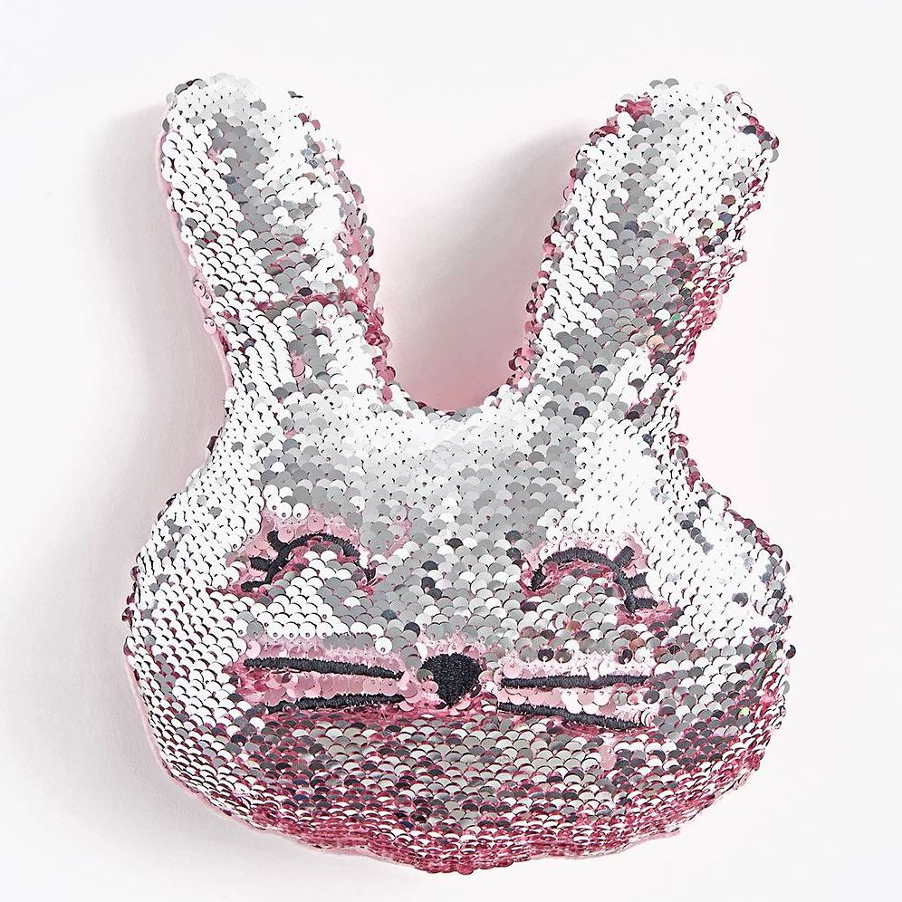 Brighten up any room this Easter with this pink sequin bunny pillow. Changes from pink to silver when you brush its sequins. Black lashes and whiskers with a matching black nose complete its look!