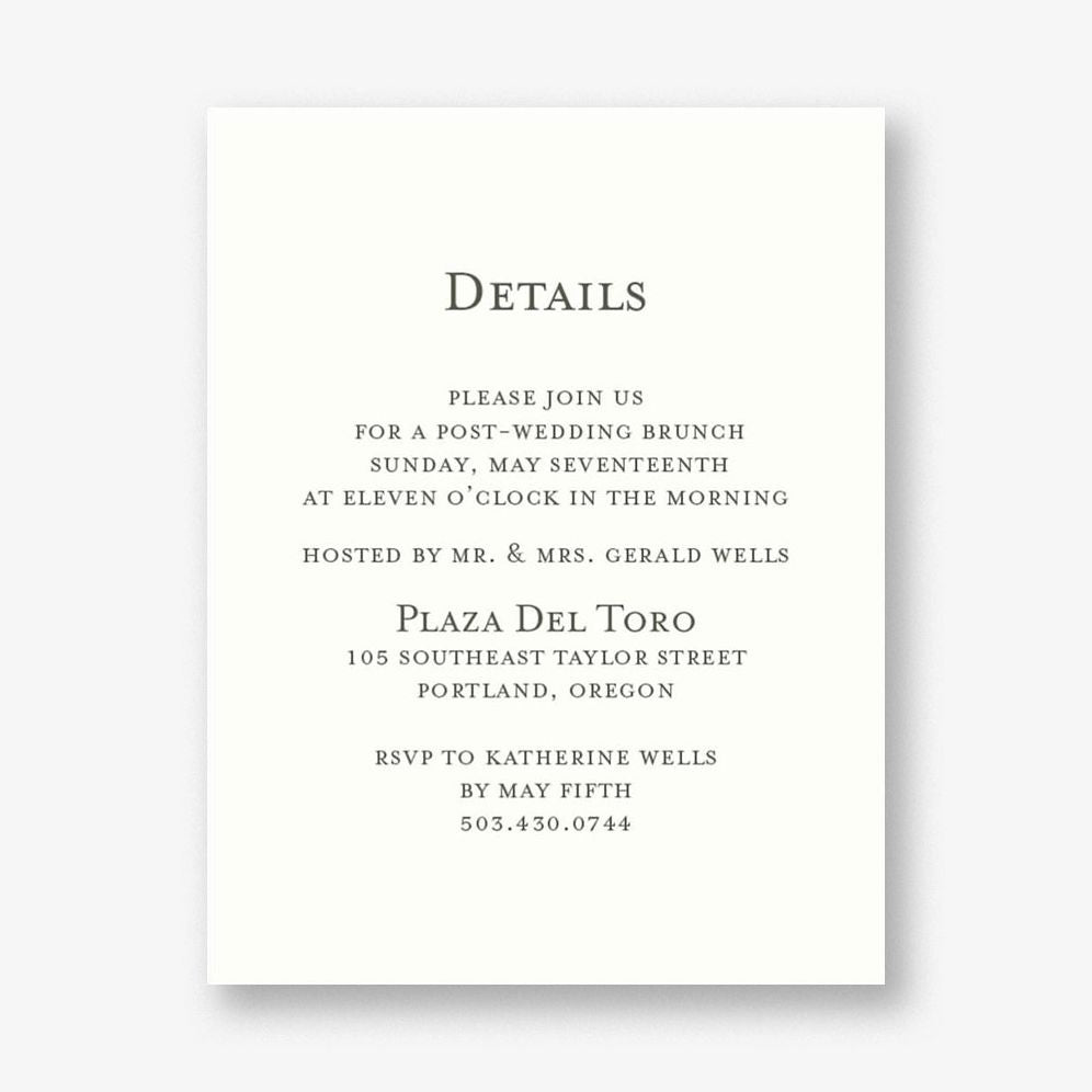 Include a separate corresponding card in your invitation suite that shares details of your event – information about your reception. accommodations. directions. and more. These types of cards do not require envelopes; simply include them with your invitation. Printed on Mohawk superfine white 130 lb. card stock that is soft to the touch and matches our superfine white envelopes. Paper is FSC certified and made using wind power.