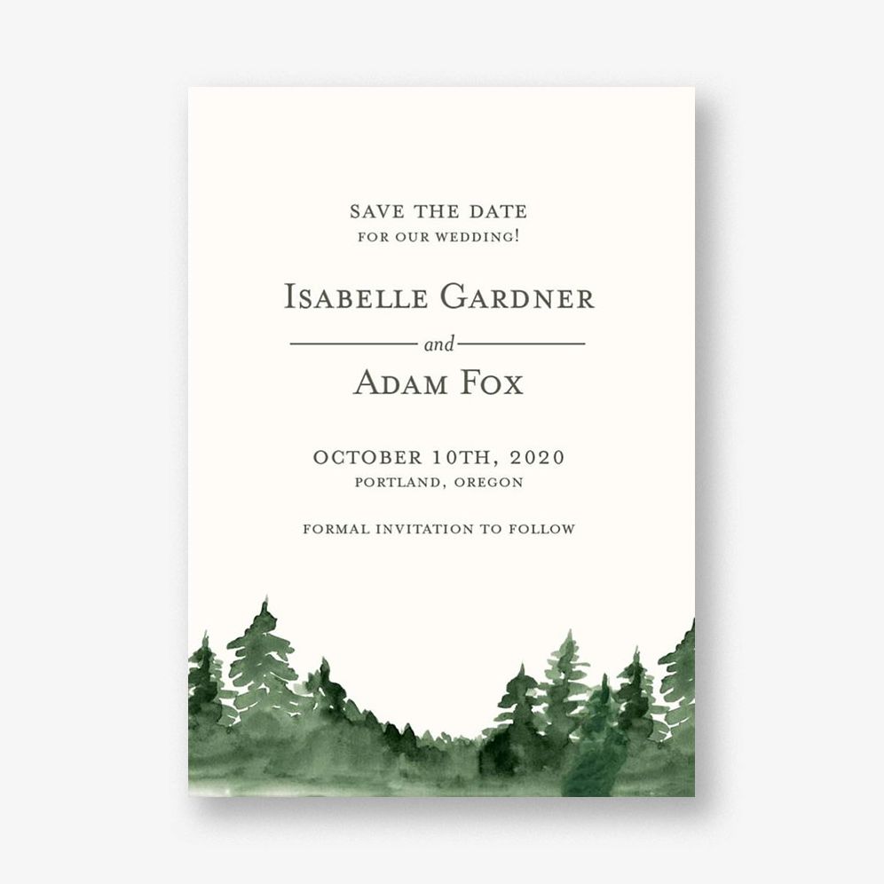 Send your save the dates with this beautiful. Sierra design that adds a rustic and stunning element. Beautifully painted trees line the bottom half of the save the date and is digitally printed with your wedding date details. Printed on Mohawk superfine white 130 lb. card stock that is soft to the touch and matches our superfine white envelopes. Paper is FSC certified and made using wind power.