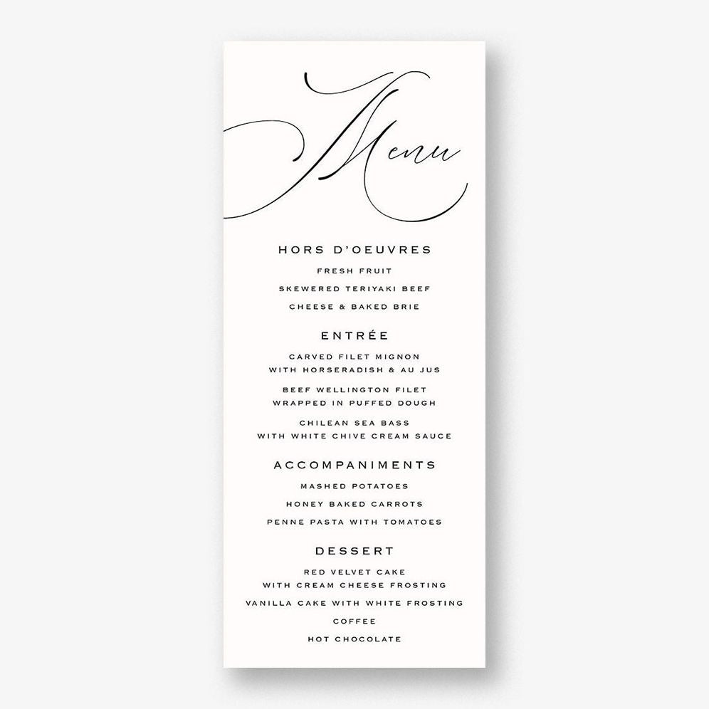 This elegant menu card features beautiful script and is a lovely complement to the rest of the Signature suite of wedding cards from the designers at Paper Source. Printed on Mohawk superfine white 130 lb. card stock that is soft to the touch and matches our superfine white envelopes. Paper is FSC certified and made using wind power.