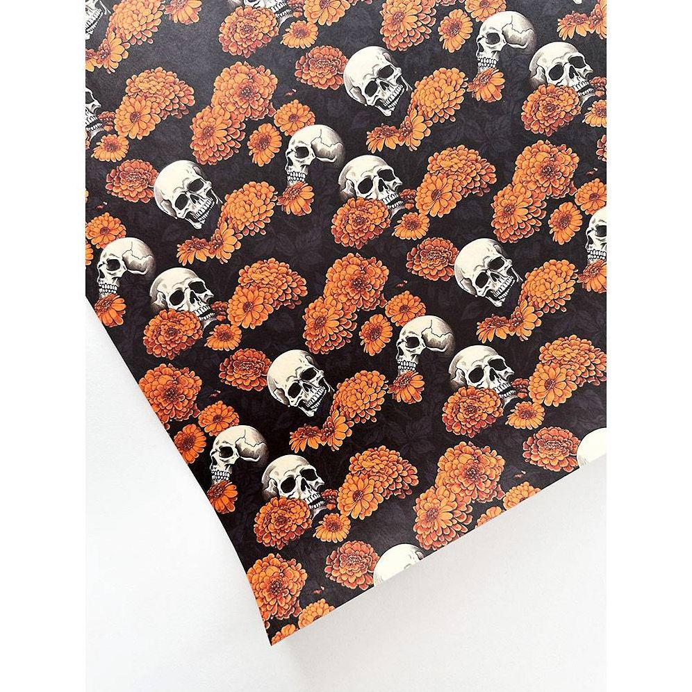 Enjoy this beautiful Halloween-inspired print with skulls and mums. This flat wrap would make a gorgeous wrapped gift. home decor or can be used for crafting during this spooky season! 30 x 20