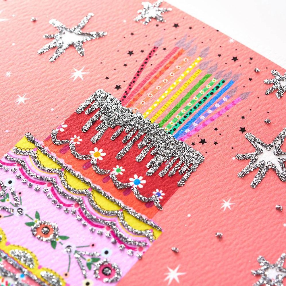 Yay! Send this festive card to celebrate a birthday. Features silver glitter and painted details.