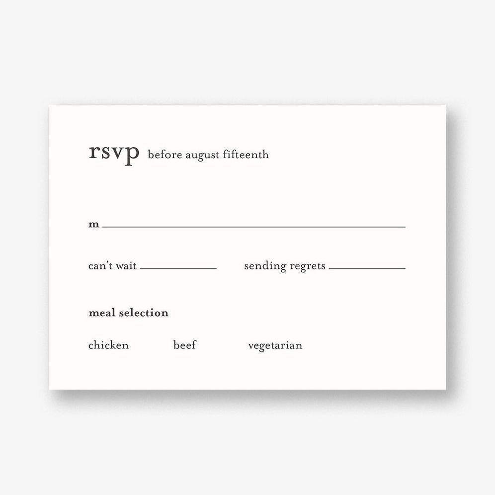 Complementing the Sprig wedding suite. the Sprig Response Card features minimalist. chic typesetting designed in-house at Paper Source. Printed on Mohawk superfine white 130 lb. card stock that is soft to the touch and matches our superfine white envelopes. Paper is FSC certified and made using wind power.