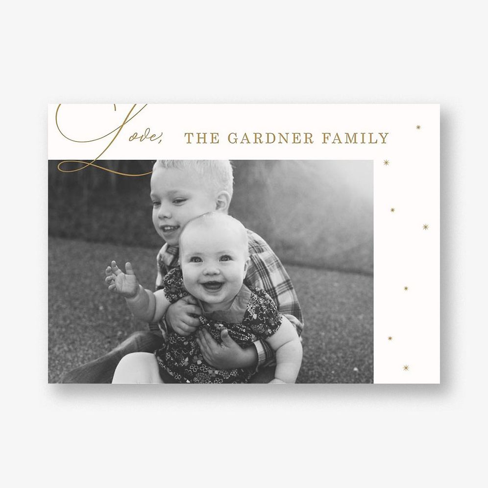 Send some love in style this holiday season with this elegant design. Personalize your message and use the back to send more photos or updates of your year!Designed by Paper Source. Printed on Mohawk ultra white 120 lb. card stock that is soft to the touch and matches our superfine white envelopes. Paper is FSC certified and made using wind power.