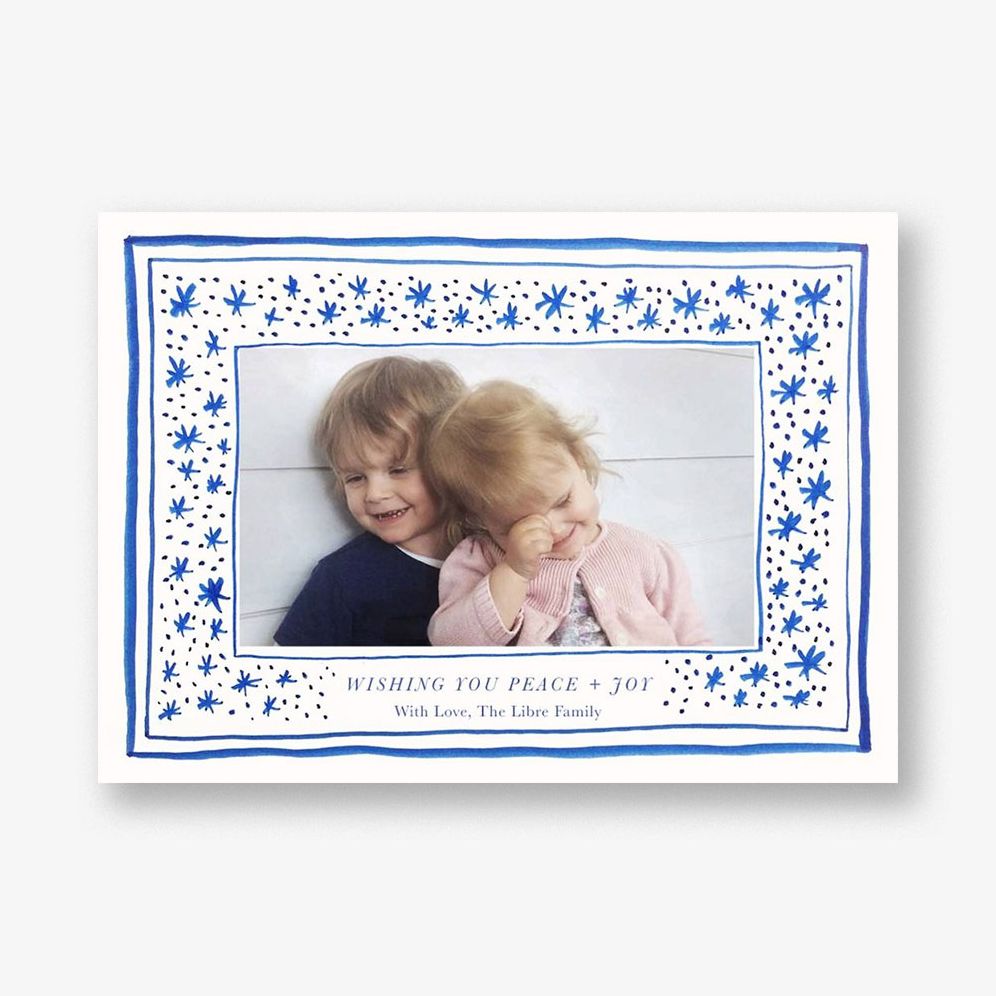 This starscape holiday photo card by Linda and Harriett for Paperless Post is the perfect way to wish those you love peace and joy. Bordered with a bold blue frame this card features a place to add a horizontal photo of you and your loved ones.