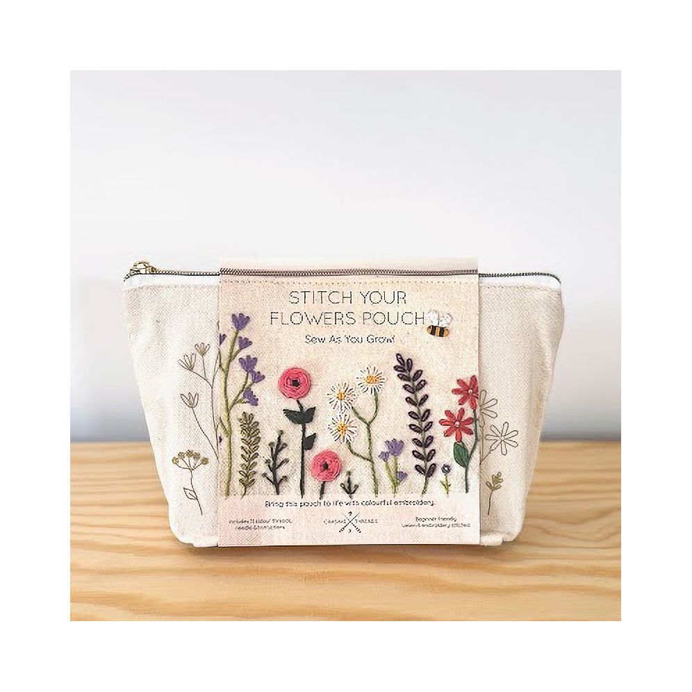 A DIY pouch kit that flourishes as you sew over the gorgeous flowers and bring the canvas bag to life with colourful embroidery! Covered with lovely hand-drawn illustrations of classic florals. our pouch already looks beautiful without any extra stitches! Born from the idea that your needlework projects should not be stuck at home in a drawer! Add colour to each flower one by one and over time zip pouch flourishes into your own embroidered work of art. Learn these 6 embroidery stitches: Stem stitch. Backstitch. Woven Rose. Lazy Daisy. French Knot. and Fishbone. Includes: Flower threadboard & needle. 11 colour threads & printed instructions.