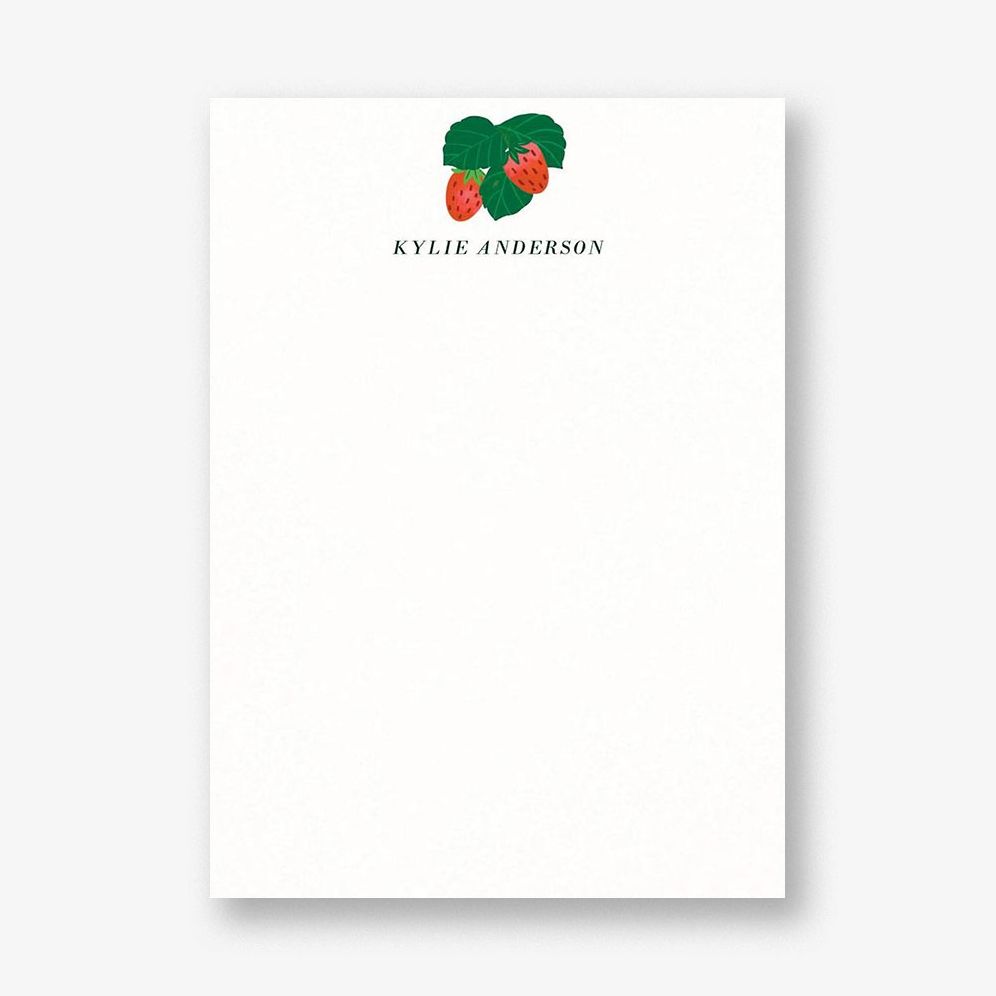 Ripe and ready to go! Sweet strawberries sit atop this stationery design made right here at Paper Source. Printed on superfine white paper. which has a smooth finish and is soft to the touch. 130# cover weight paper with 30% post consumer recycled content.