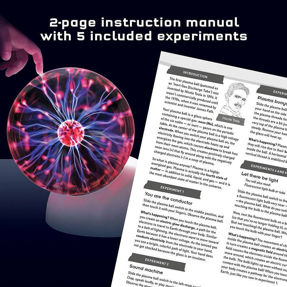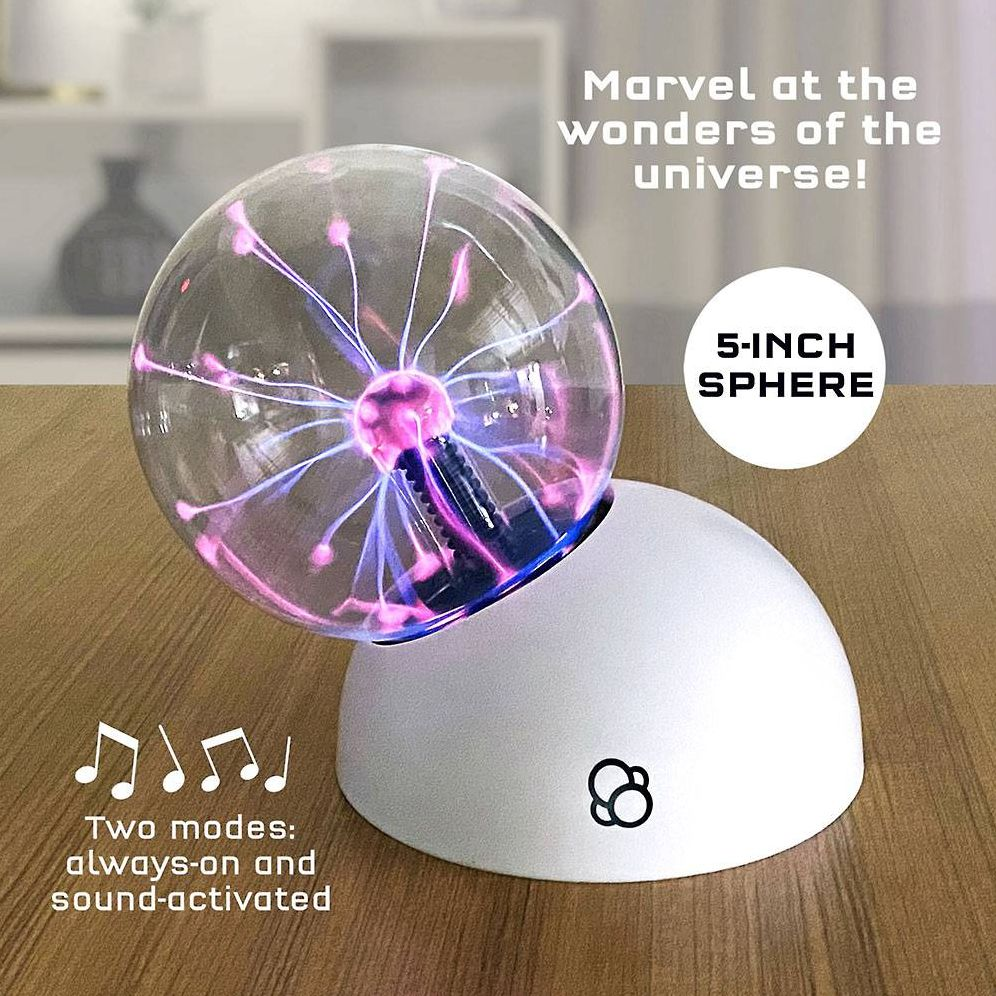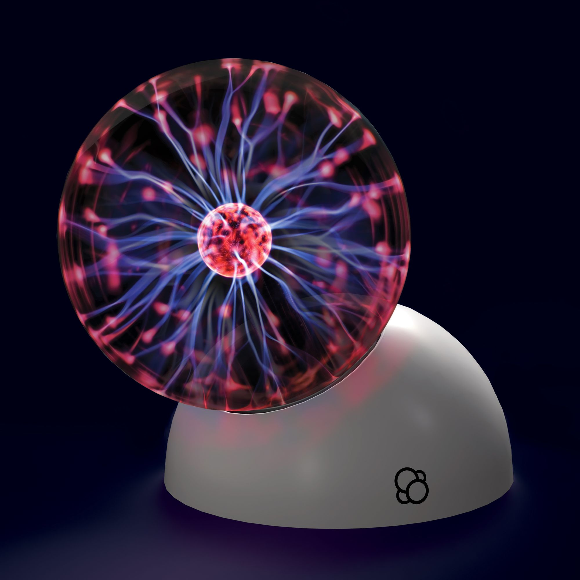 Marvel at the wonders of the universe with this mesmerizing electric light show. The plasma ball creates a fascinating display of glowing electric tentacles. like lightning flowing from your fingertips. Plasma is the fourth state of matter. Neither solid. liquid. or gas. it is a super-charged ionized gas found in every star. The plasma ball works by sending a high-voltage. alternating current from a Tesla coil at its core. through a noble gas. to the inner surface of the glass sphere. Escaping electrons cause the inert gas inside the sphere to light up. creating the amazing effects. You can actually see electricity in the palm of your hand with this incredible device. The plasma ball design allows you to display it on a tabletop or hang it on a wall like a sconce. It can be powered via a USB-C cable or batteries. Turn on the sound-activated mode and watch the plasma arcs dance to the beat of your favorite song. Learn about electricity. matter. and energy. Bring physics to life with electrifying experiments. Interactive electricity light show Features: 5-inch glass sphere Beautiful new design Two modes: always-on and sound-activated USB-C power port and cable included (power adapter not included) Also works with 4 AAA batteries (not included) Hangs on a wall or rests on a tabletop Safe to use. Follow all instructions and precautions. Classic scientific device with a fresh new design Battery or USB powered. ensuring maximum usage time