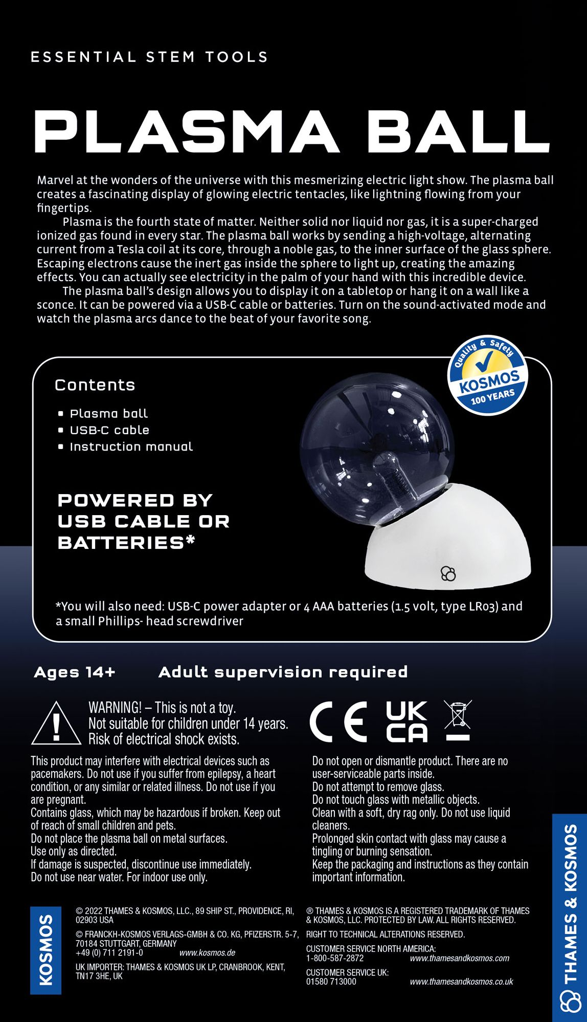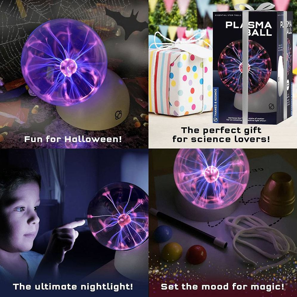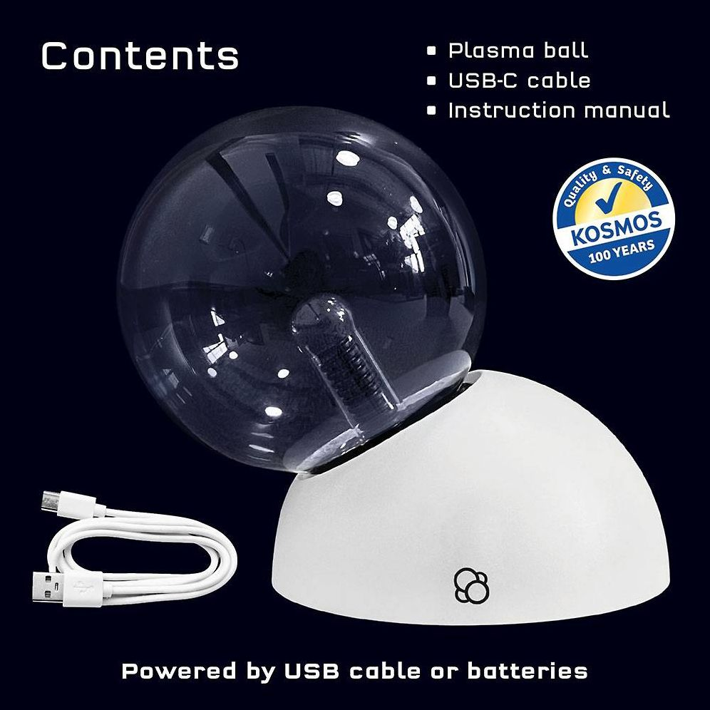 Marvel at the wonders of the universe with this mesmerizing electric light show. The plasma ball creates a fascinating display of glowing electric tentacles. like lightning flowing from your fingertips. Plasma is the fourth state of matter. Neither solid. liquid. or gas. it is a super-charged ionized gas found in every star. The plasma ball works by sending a high-voltage. alternating current from a Tesla coil at its core. through a noble gas. to the inner surface of the glass sphere. Escaping electrons cause the inert gas inside the sphere to light up. creating the amazing effects. You can actually see electricity in the palm of your hand with this incredible device. The plasma ball design allows you to display it on a tabletop or hang it on a wall like a sconce. It can be powered via a USB-C cable or batteries. Turn on the sound-activated mode and watch the plasma arcs dance to the beat of your favorite song. Learn about electricity. matter. and energy. Bring physics to life with electrifying experiments. Interactive electricity light show Features: 5-inch glass sphere Beautiful new design Two modes: always-on and sound-activated USB-C power port and cable included (power adapter not included) Also works with 4 AAA batteries (not included) Hangs on a wall or rests on a tabletop Safe to use. Follow all instructions and precautions. Classic scientific device with a fresh new design Battery or USB powered. ensuring maximum usage time