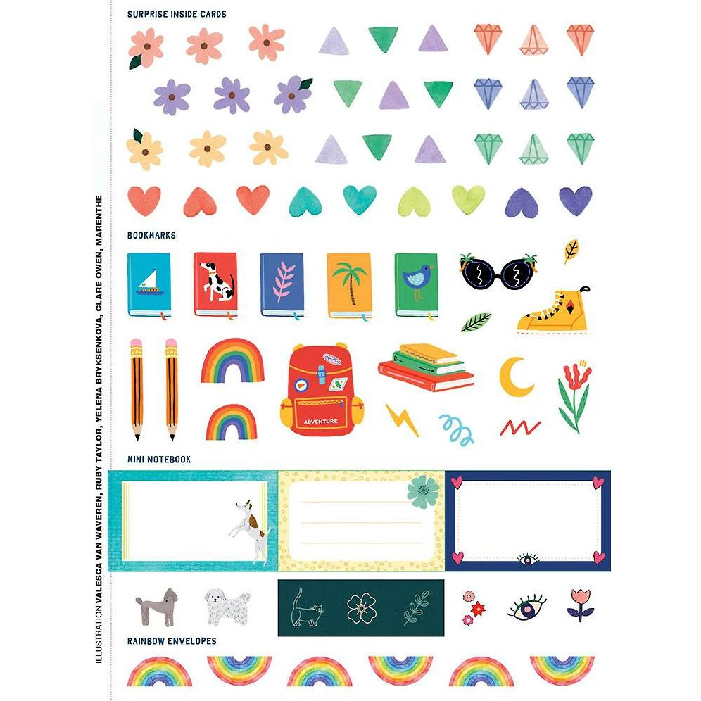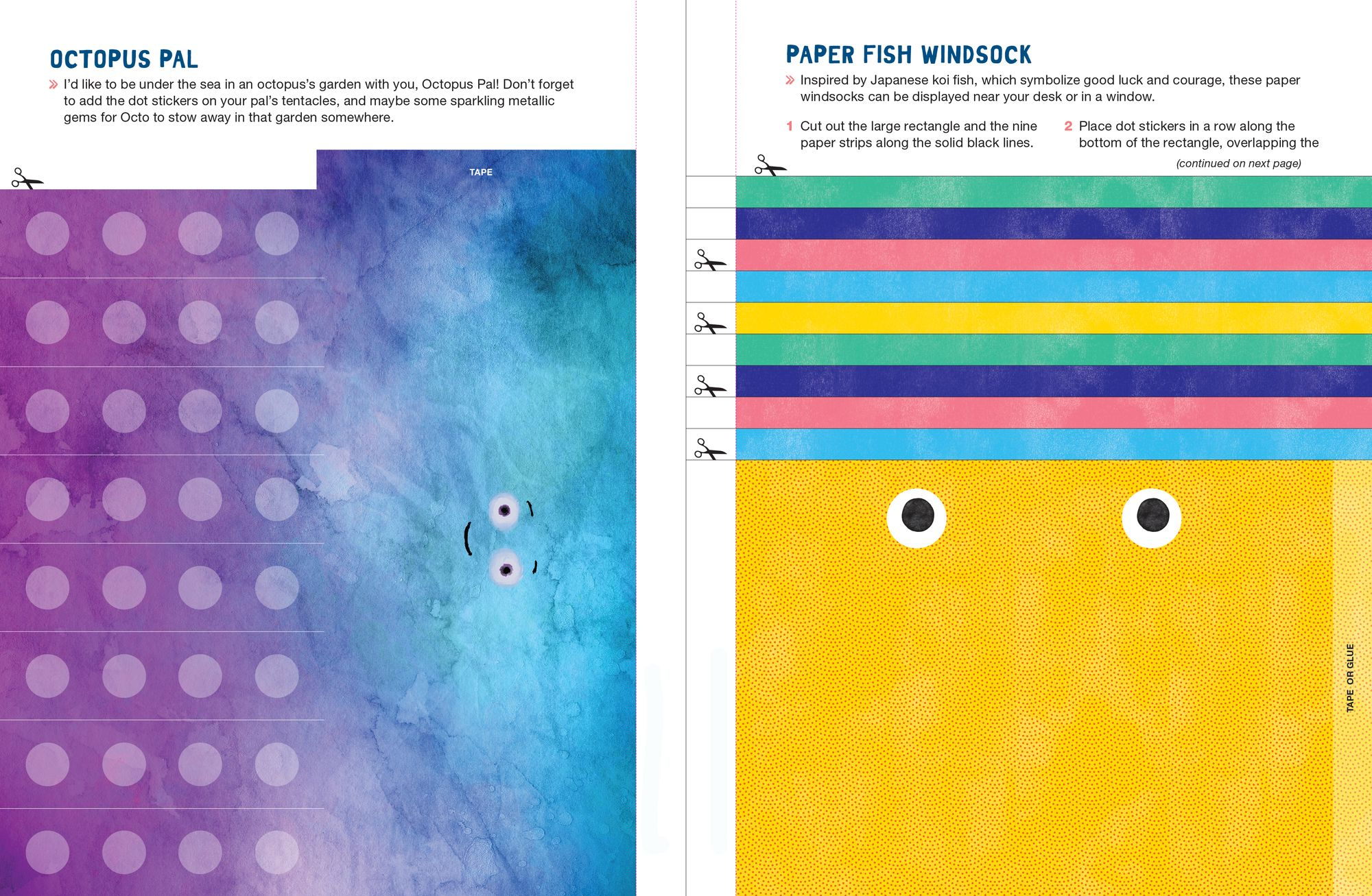 Sticker-packed papercraft projects includes a dot-sticker necklace; a foldable paper globe; a paper crown with sticker gemstones; tiny rainbow notes and envelopes; and origami finger puppets with sticker eyes. ?