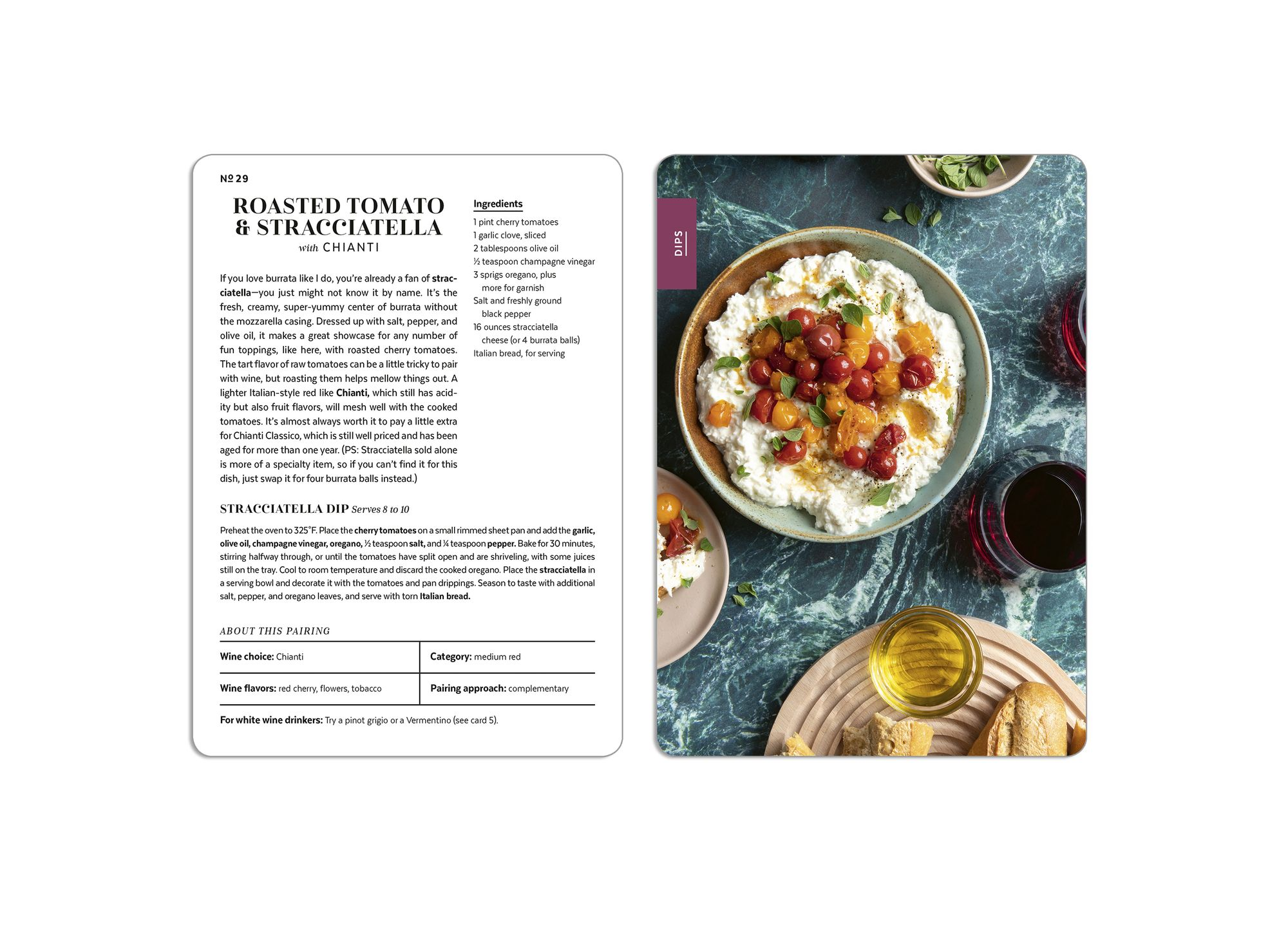 Meg simplifies the selection process by including plenty of substitutions and wines under $25 so you can tailor the pairings to your taste and budget. The informational cards?in The Wine and Cheese Board Deck provide a helpful primer on picking and tasting wine so you can learn how different wine profiles complement various cheeses. allowing you to create your own combinations. And each card offers a photograph on the front to guide your assembly and a simple recipe on the back with wine tasting notes. You’ll find classic combos like Aged Cheddar Phyllo Bites with Cabernet Sauvignon and Spanish Cheese and Tapas with Rioja and more inventive pairings. including Cheesy Fondue with Pinot Gris and Deconstructed Mozzarella Stick with Lambrusco.