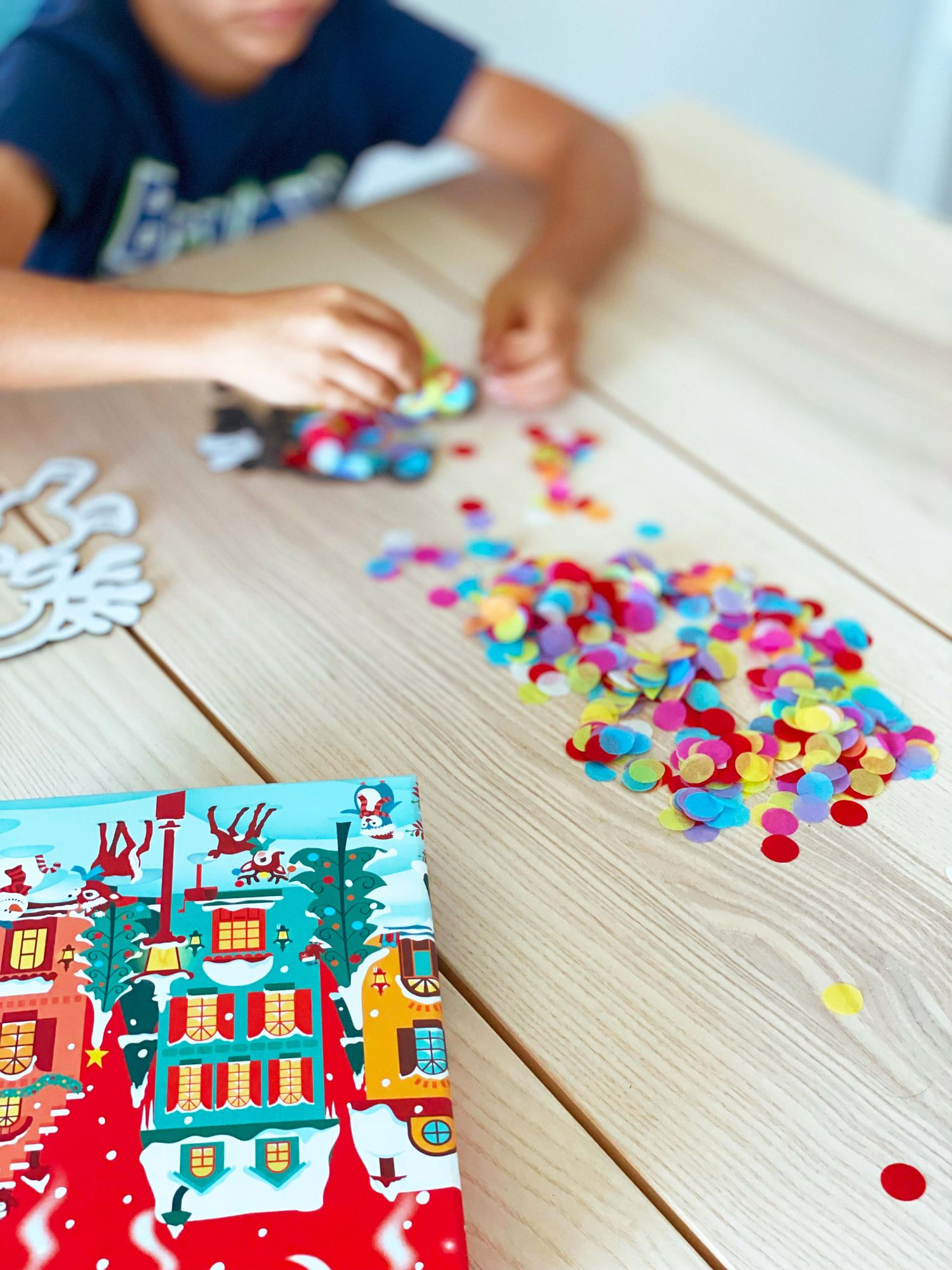 Includes: 4 (2-piece) felt frame shapes. assorted multi-colored tissue paper circles. 4 suction cups and instructions. all in a holiday keepsake storage box made from recycled cardboard.