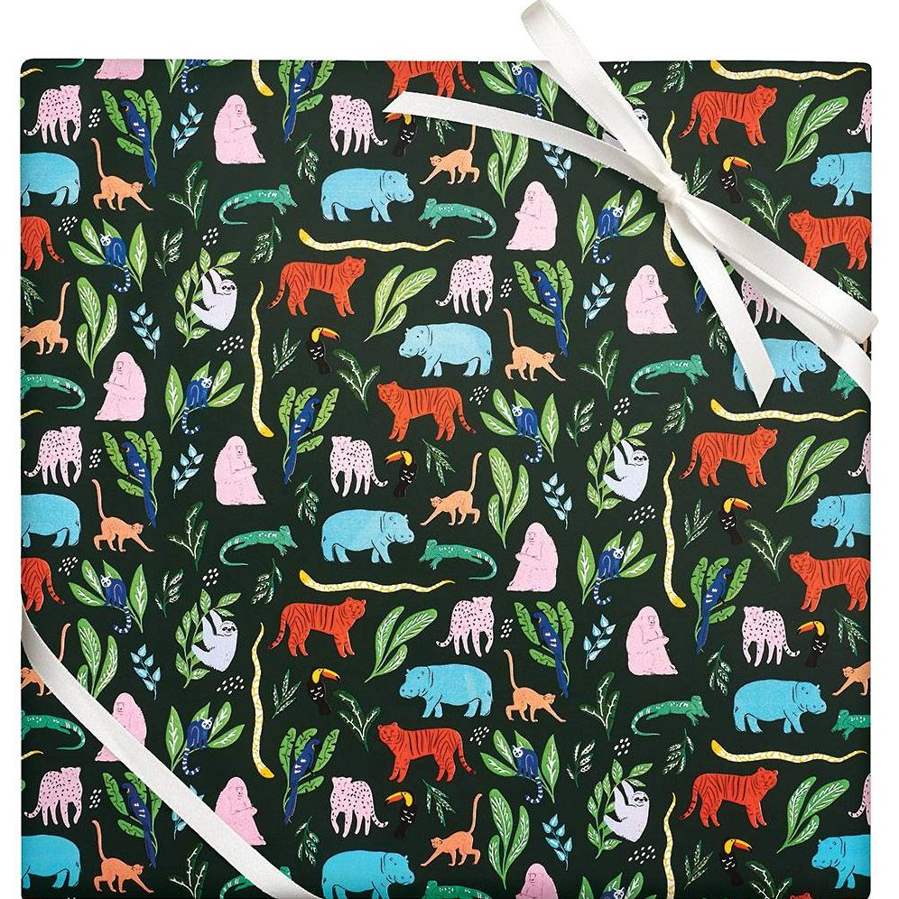 This adventurous and tropical animal-themed gift wrap is a menagerie of colorful creatures. This whimsical design is great for all of your gifting needs.
