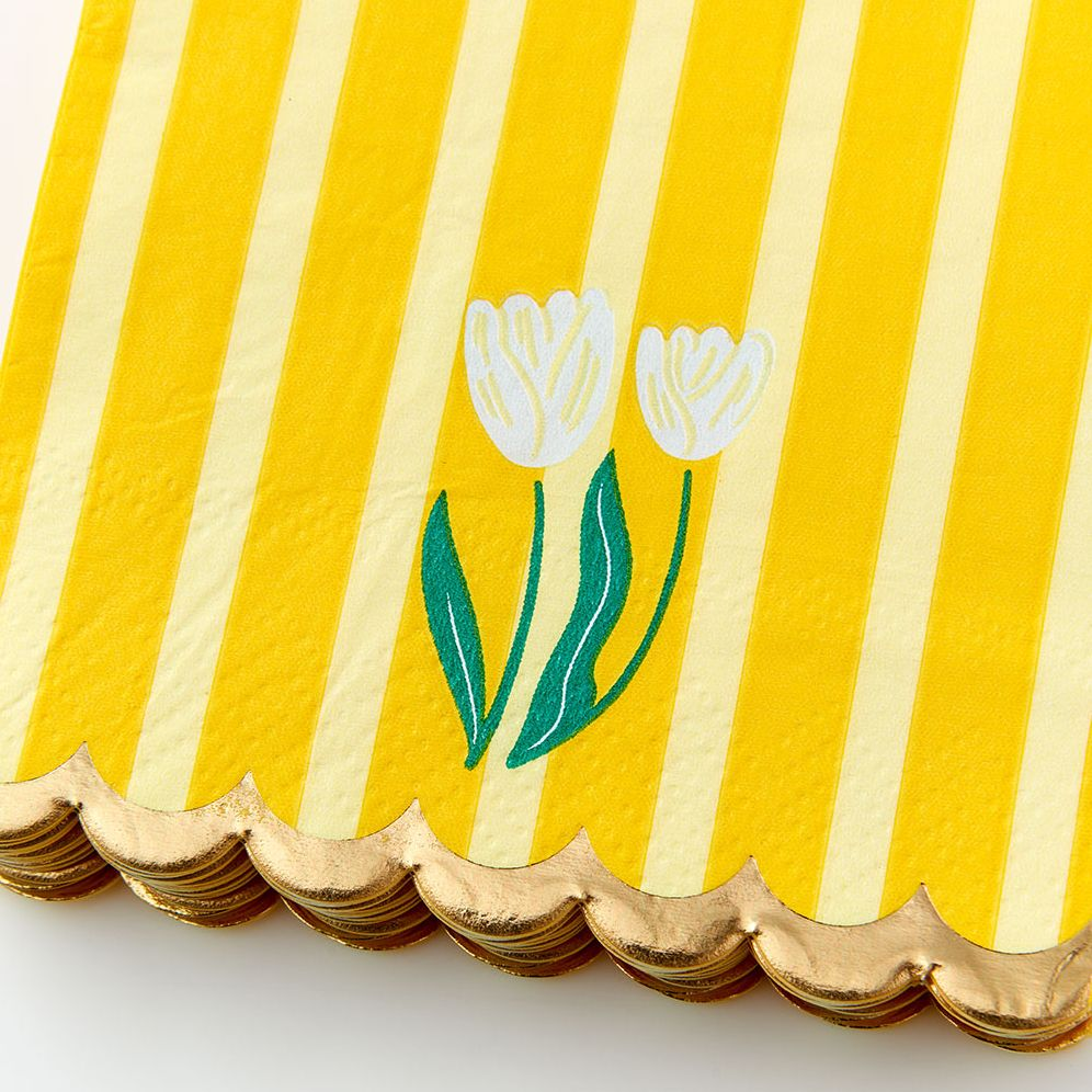 Gorgeous yellow stripe and tulip guest napkins perfect to celebrate spring! Features bold and bright colors in 3-ply material. PS Designed.