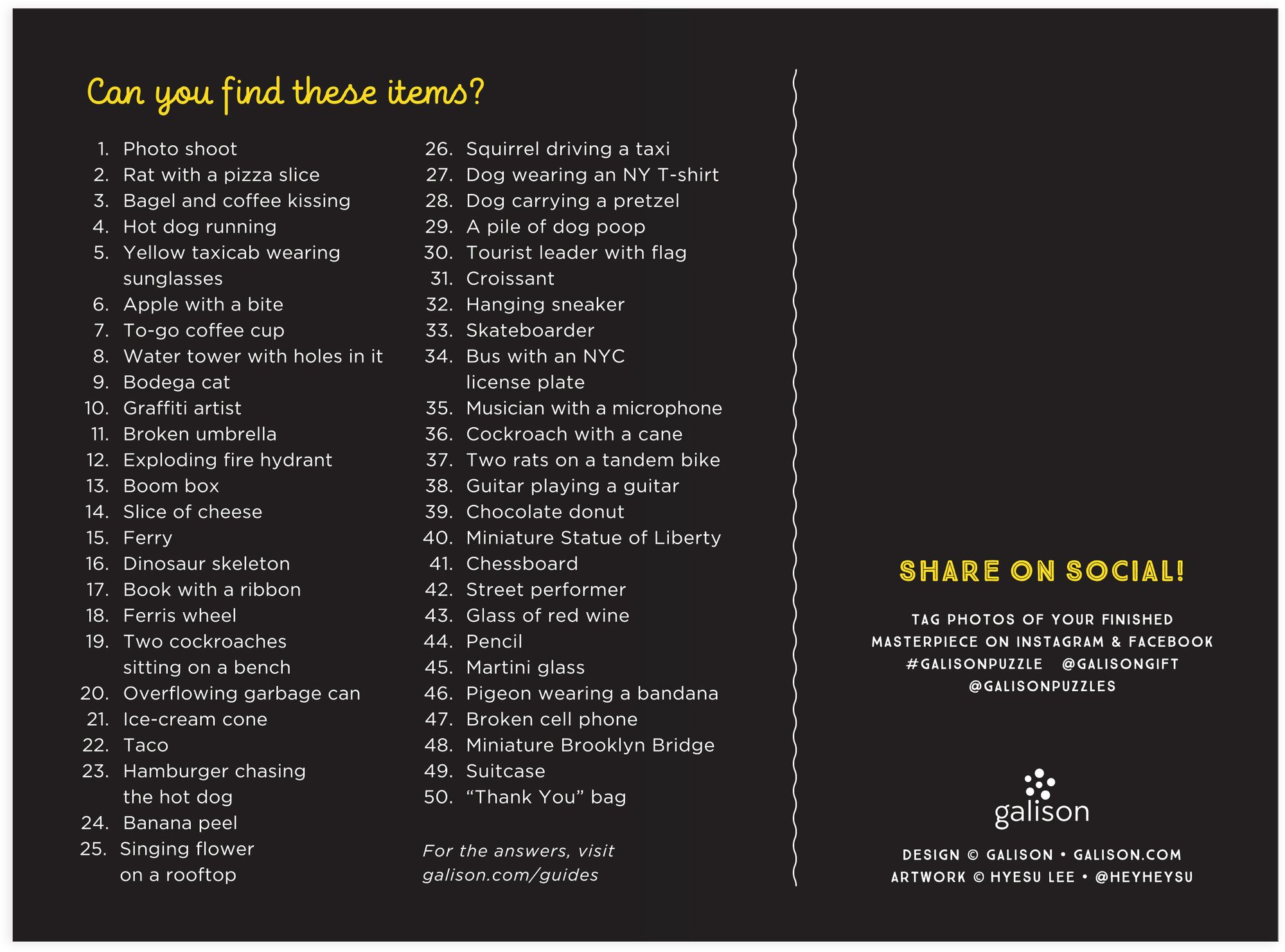 The Uncovering New York City 1000 Piece Search & Find Puzzle from Galison buries 50 fun items to find with an animated perspective on city life by Hyesu Lee. She is an illustrator. artist. muralist. and educator who uses comics as a medium without language barriers to capture vignettes of the everyday experiences that connect us all.
