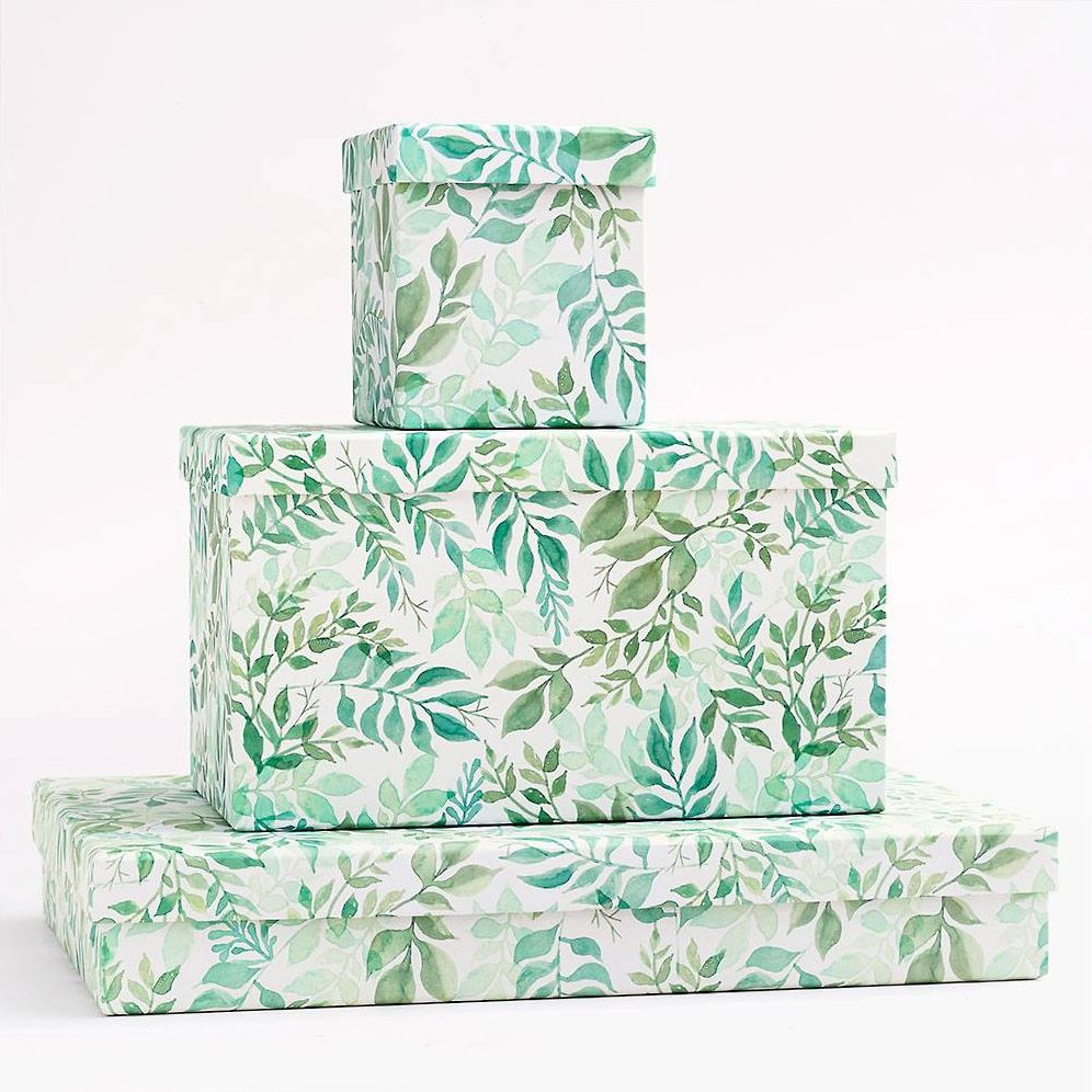Delicate watercolor leaves decorate the outside of this gift box. Would be a wonderful choice for weddings. bridal showers. birthdays and anywhere else you need a touch of elegance. These boxes would also make beautiful home storage too!