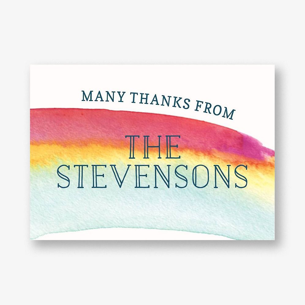 A beautiful streak of watercolor plays across the face of the Watercolor Rainbow Baby Thank You Notes. created by the designers here at Paper Source. Printed on Mohawk superfine white. 100 lb. card stock that is soft to the touch and matches our superfine white envelopes. Paper is FSC certified and made using wind power.