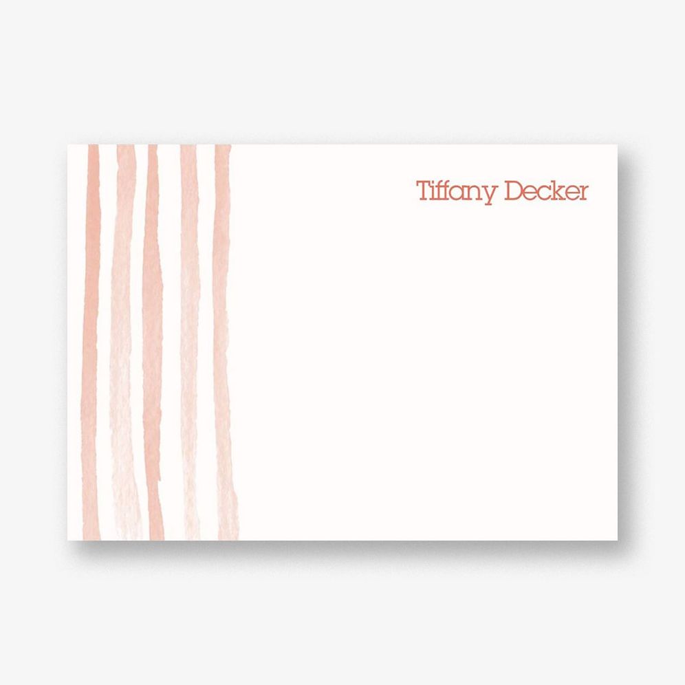 Beautiful hand-drawn watercolor stripes create a gentle border on this lovely personalized stationery. Printed on superfine white paper. which has a smooth finish and is soft to the touch. 130# cover weight paper with 30% post consumer recycled content.