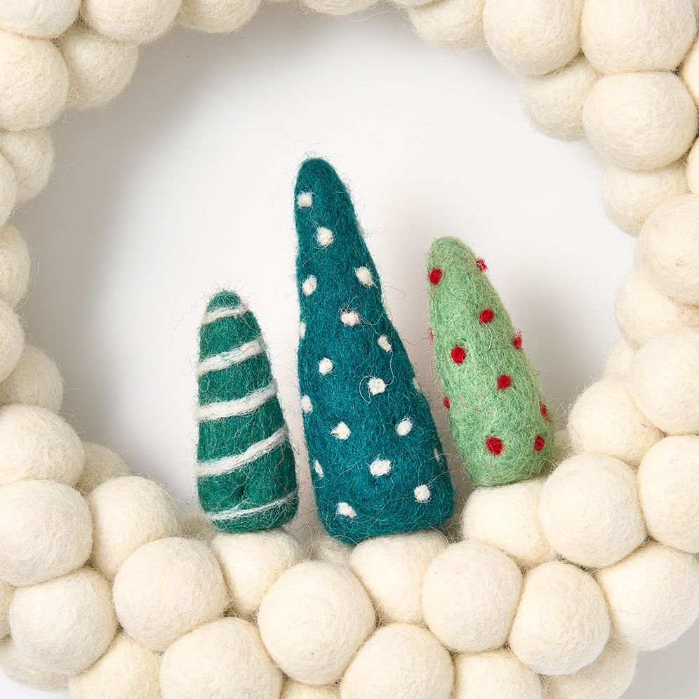 This white felt pom wreath features 3 cute trees in the center!