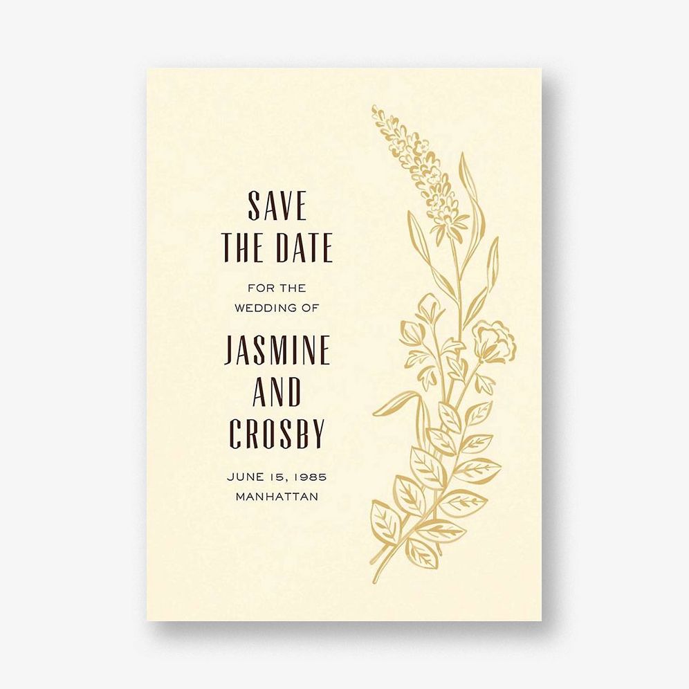 Inspired by the untamed beauty of wild meadows. these cards feature a soft and warm earthy hue that creates a carefree charm to invite your loved ones to mark their calendars for a celebration as beautiful and unique as your union. Printed on Mohawk superfine white 130 lb. card stock that is soft to the touch and matches our superfine white envelopes. This paper is FSC certified. with 30% post-consumer recycled content. and made using wind power. Need to send your announcement ASAP? You can with our partners at Paperless Post.