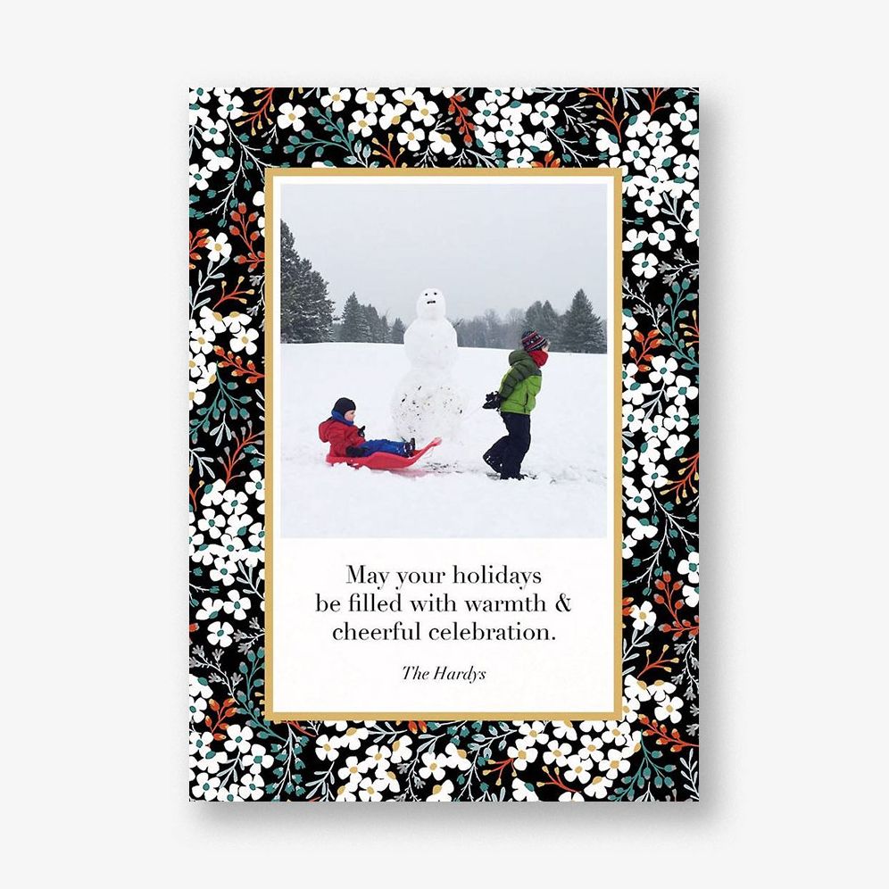 Let those you love know that you’re thinking of them with this personalized holiday photo card from kate spade new york by Paperless Post. This card pictures a lovely winter floral border and can be further customized with a message from you and your family. Printed on Mohawk ultra white 120 lb. card stock that is soft to the touch and matches our superfine white envelopes. Paper is FSC certified and made using wind power.