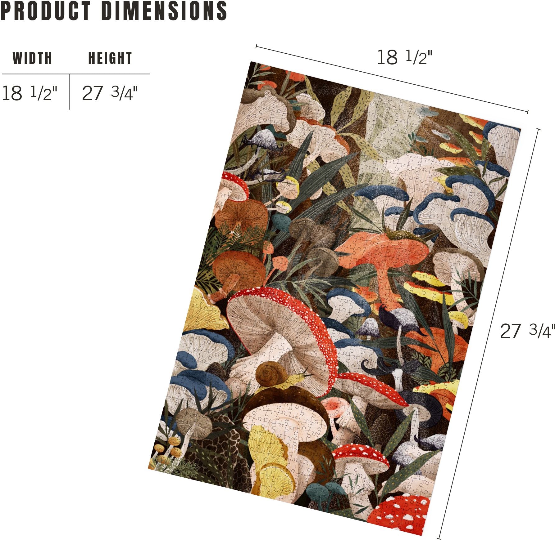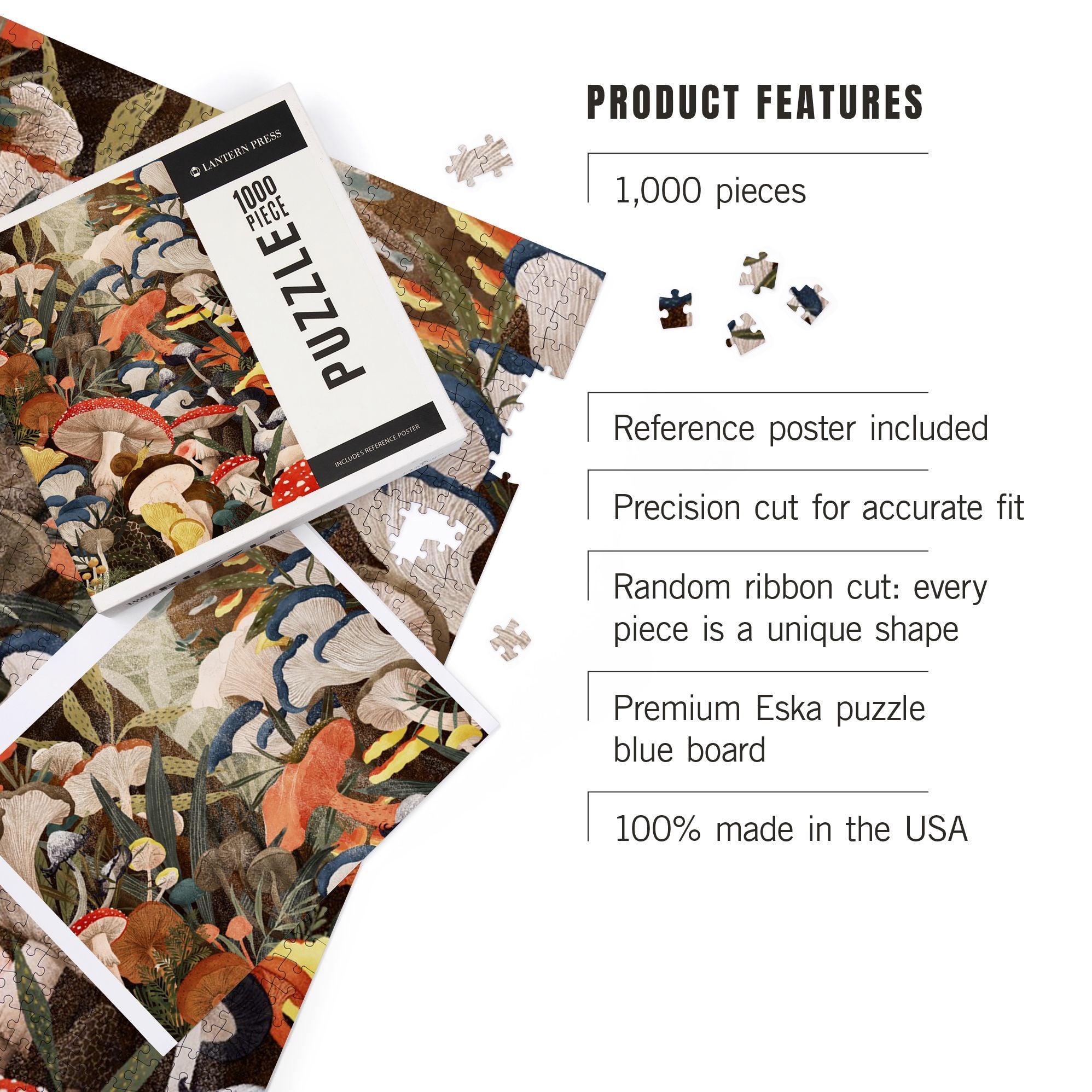 Light filters through the trees. down to the forest floor revealing a world of colorful mushrooms. This fun and challenging 1000-piece puzzle. features random ribbon cut peices; there are no false fits because every piece is a unique shape. Matte linen paper. and extra thick puzzle board create a premium quality look and feel.