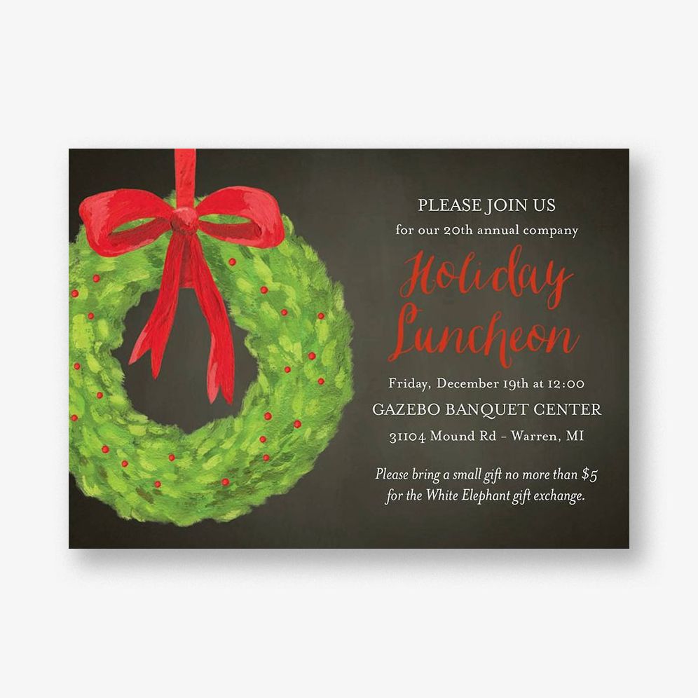 Our hand painted holly wreath looks stunning on a dark background. A wonderfully festive holiday party invitation that is sure to set the tone for your celebration! Printed on Mohawk ultra white 120 lb. card stock that is soft to the touch and matches our superfine white envelopes. Paper is FSC certified and made using wind power.