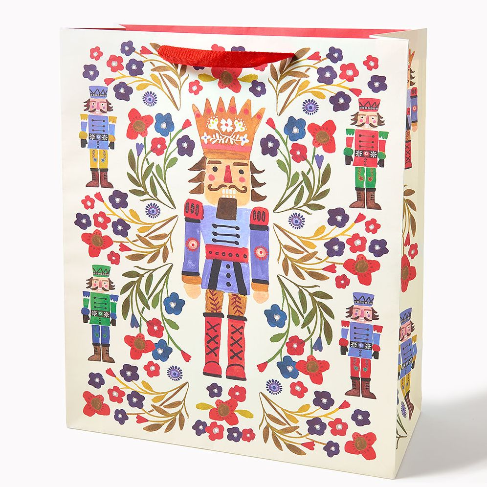 Bring holiday tradition to your gifts with this vibrant bag featuring a bold nutcracker surrounded by colorful florals. With rich. whimsical details and red ribbon handles. it’s the perfect way to wrap presents with a cheerful. storybook-inspired touch.