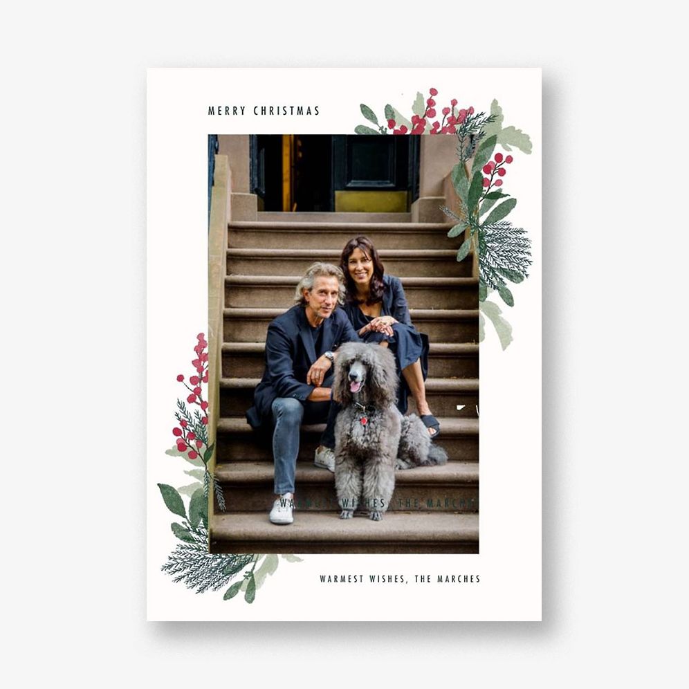 Send warm wishes and happy thoughts to those you love with this holiday photo card by Paperless Post! Insert your family photo inside this adorably bordered yule blooms and Christmas greens.