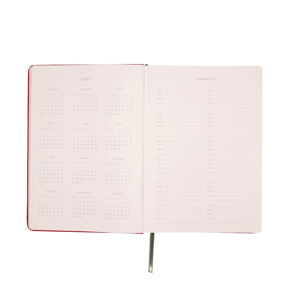 Set your monthly goals. important to-dos. birthdays. anniversaries. and more to stay organized throughout the year! This 12-month dated monthly planner (Jan. 2026 – Dec. 2026) features a flexible faux leather cover with matte cream foil design and an elastic band closure. Includes monthly grid spreads for planning. lined notes pages. and a ribbon bookmark to easily keep track of where you left off. Interior front cover also features useful conversion charts and world times.