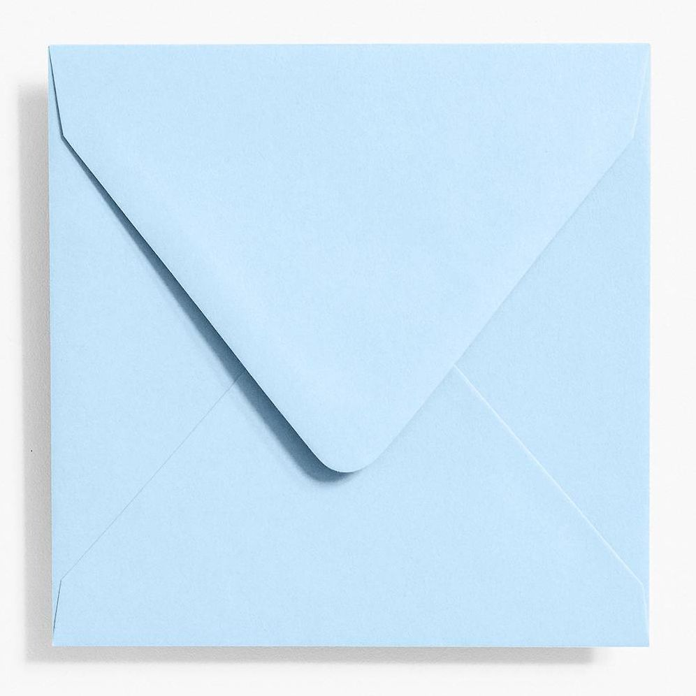 A stylish square envelope with our European inspired pointed flap in which an 8 1/2 x 11 sheet fits with just a single cut. An additional postage charge for being hip and square does apply. In bluebell. a calm. adult sky blue without a trace of sappiness.