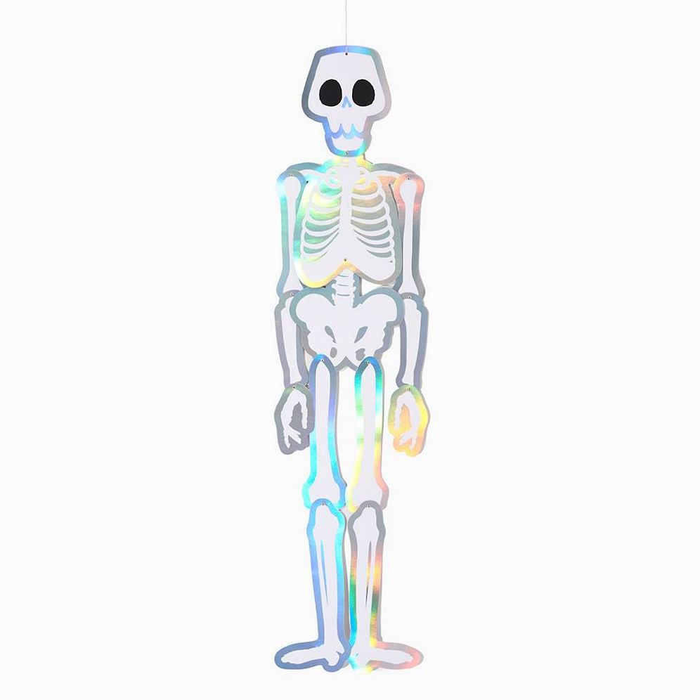 Hang up a frightening friend with this fun full-sized skeleton. Featuring holographic details and bendable joints. this 5′ pal is the perfect addition to your Halloween d??cor!