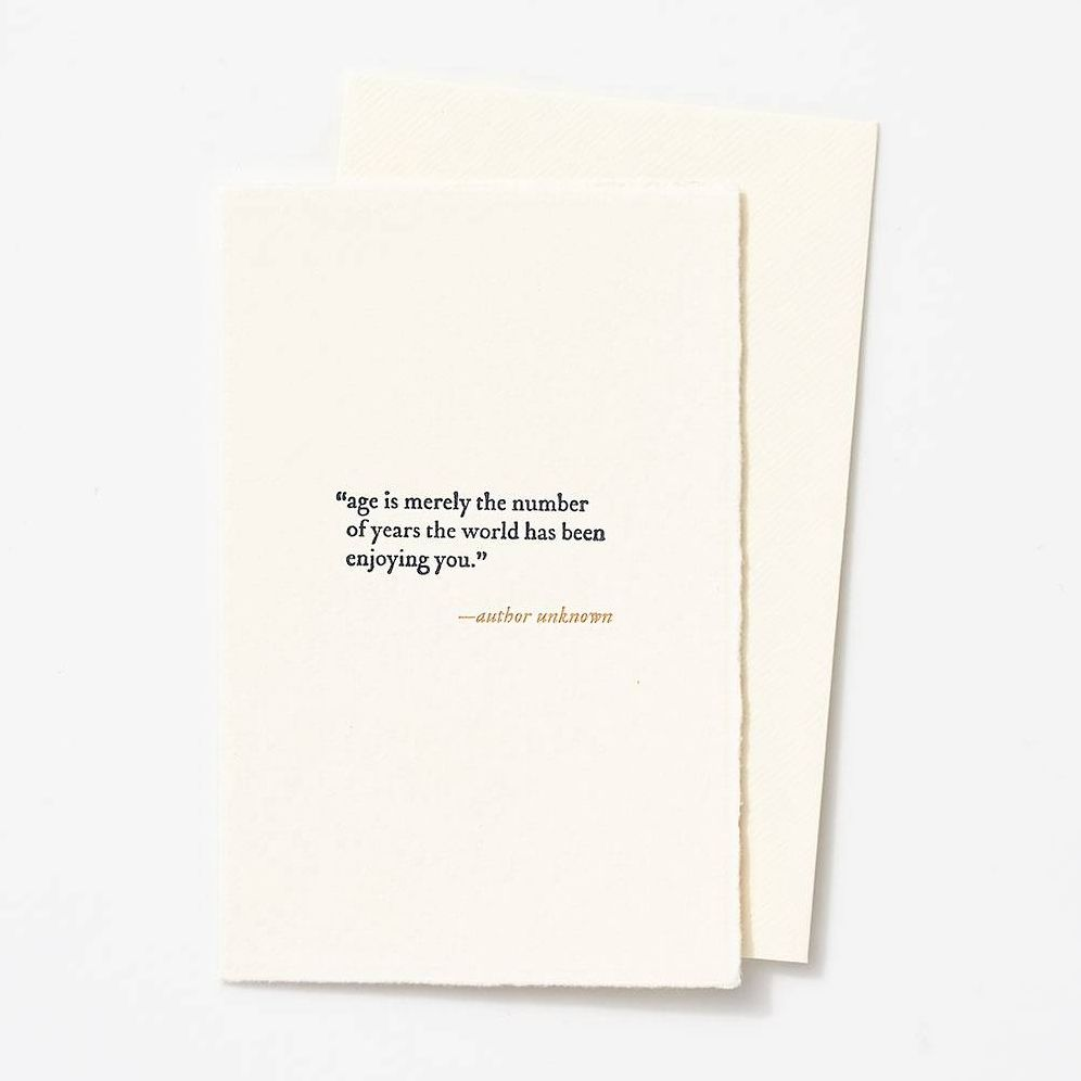 Don’t worry about your age. it’s merely the number of years the world has been enjoying you! With its beautiful quote. this finely crafted card is the perfect sweet sentiment. Blank inside. Paired with coordinating envelope. By Occasionally Speaking.