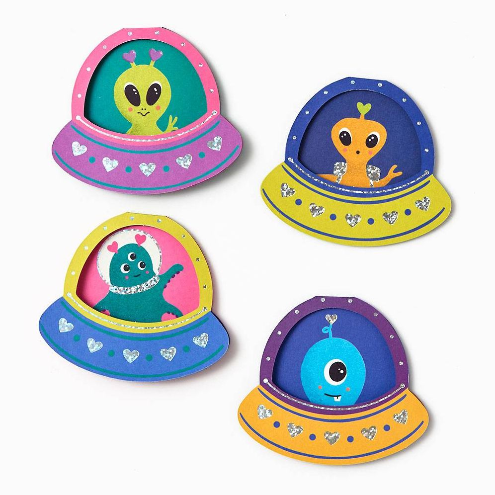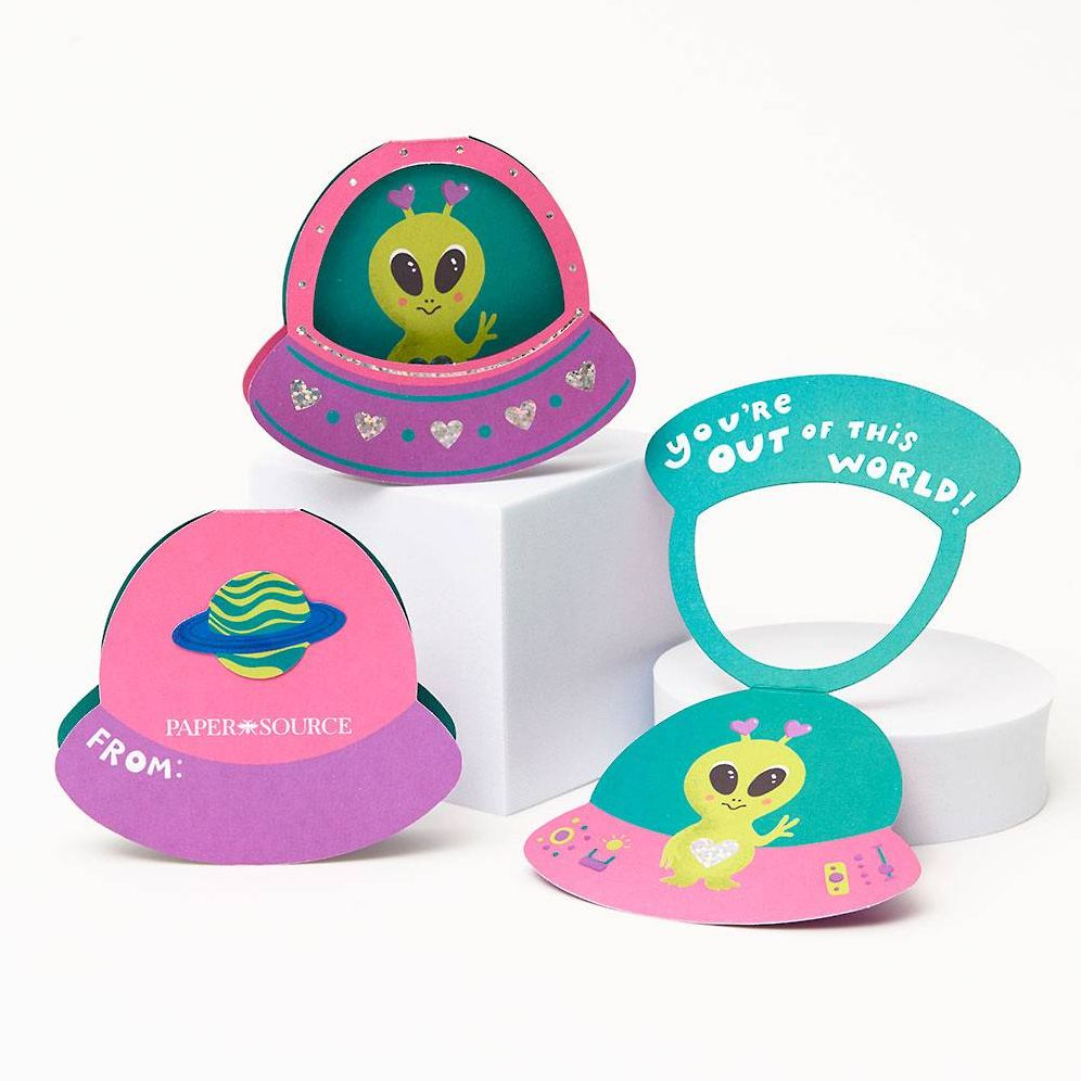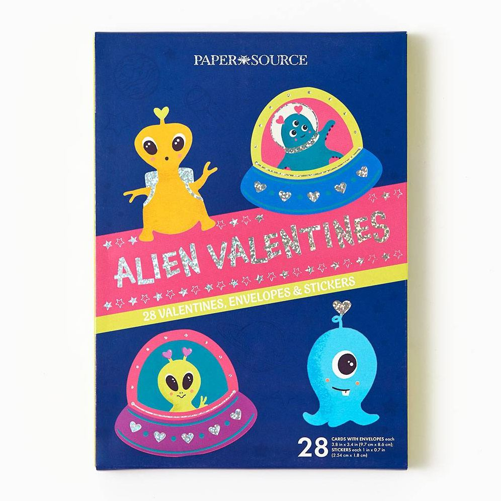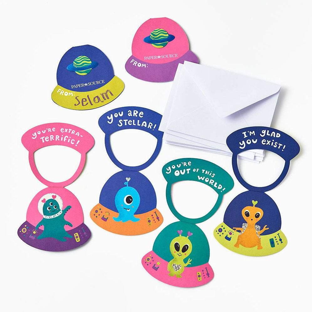 These adorable aliens are sure to please any recipient! They each come in their own little space ship and all have a unique design! Set of 28 and comes with white envelopes. Cards are 3.5 x 4. Designed by Paper Source.