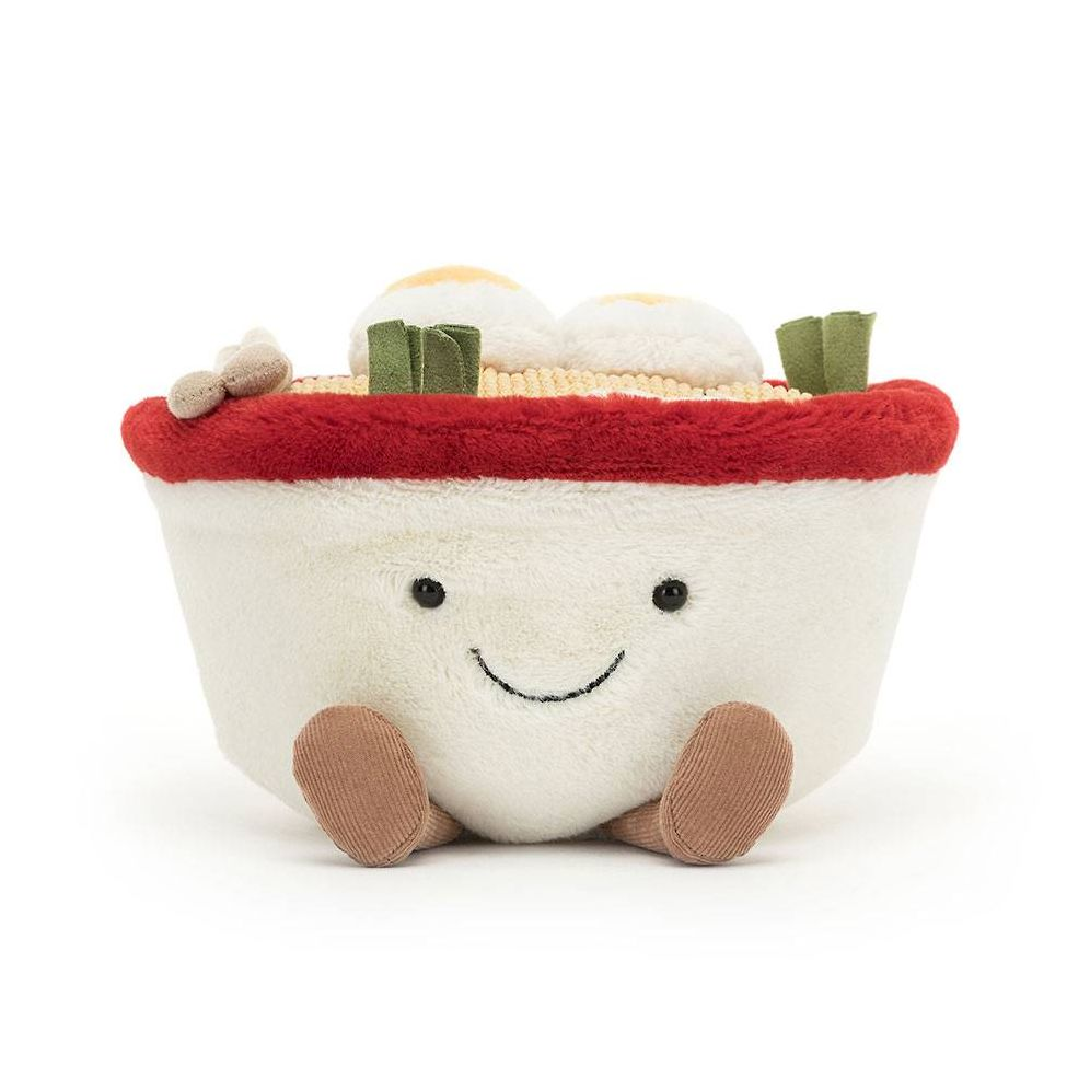 Amuseable Ramen is full of kawaii charm. from the cream-and-red bowl to the suedette chopsticks. Filled with wavy cord noodles. suedette spring onions and fluffy boiled eggs. as well as a pink embroidered fish cake. this dish is a wish come true.