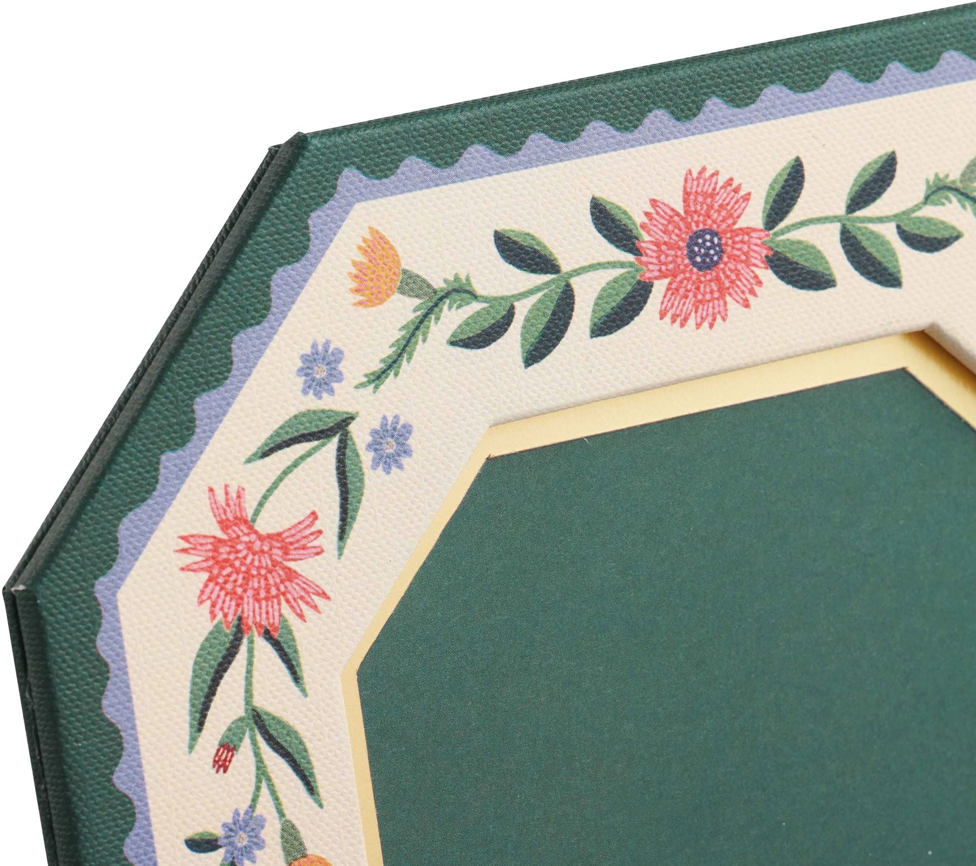 Your memories. framed by flowers. An octagonal paper-wrapped frame for a 4×6 photo with illustrated designs. a metallic gold photo mat. and a kickstand for display.
