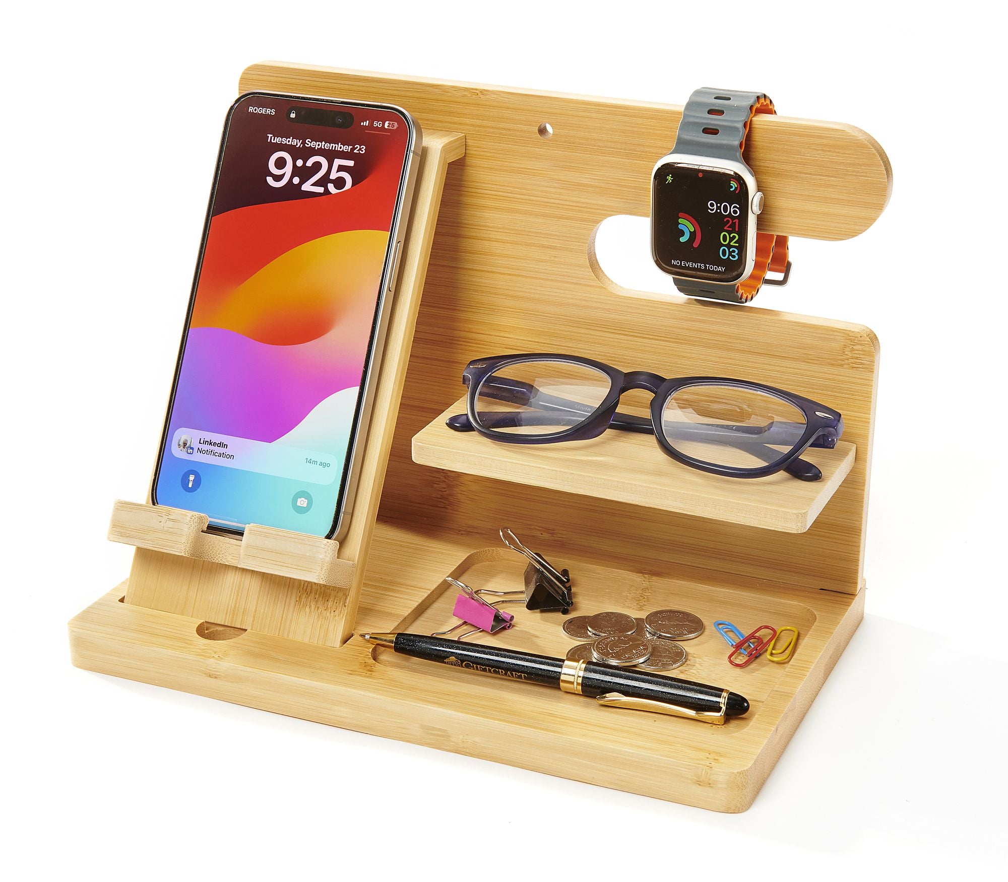 An upright phone stand designed to accommodate a charging cord. with a dedicated space for jewelry and watches. Includes a sturdy shelf to keep fragile items safe. plus a small tray for organizing tiny trinkets and gadgets.