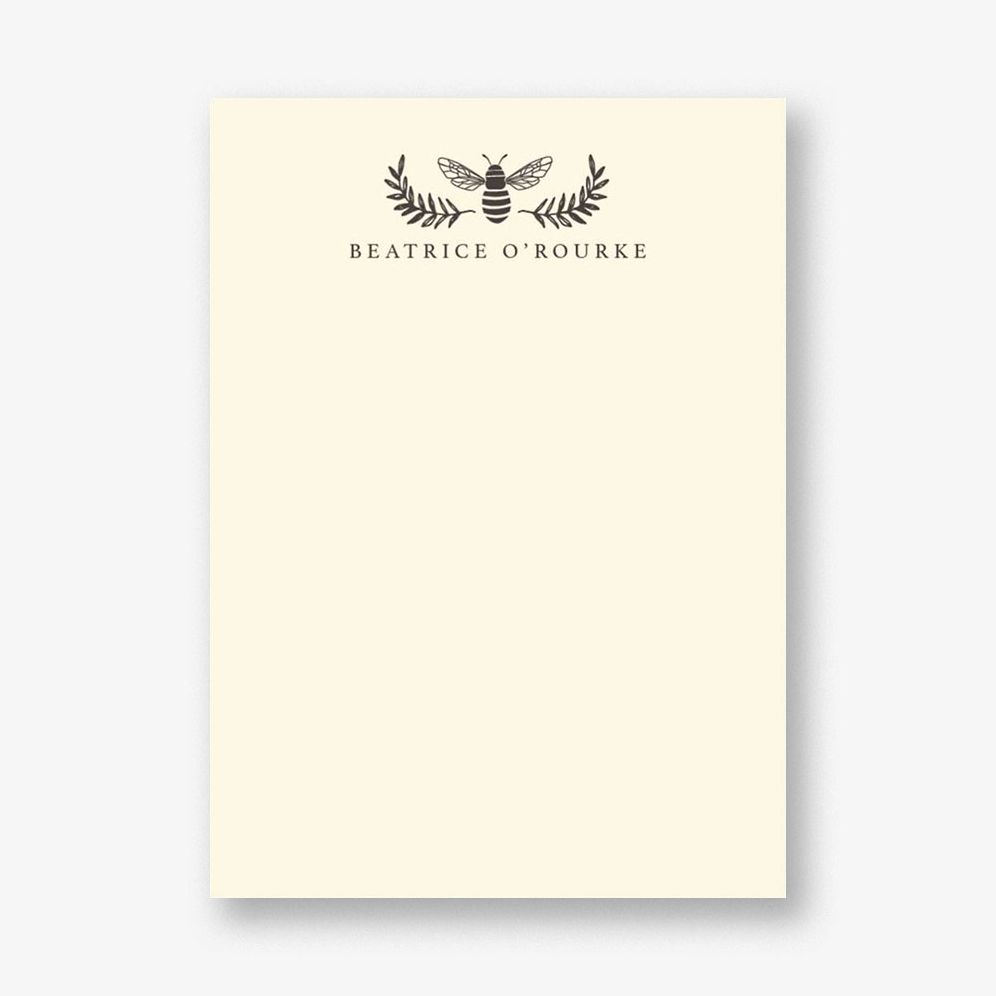This personalized stationery features a charming bee drawing with beautiful laurels surrounding it. Printed on superfine soft white 130 lb. card stock that has a smooth finish and is soft to the touch. Paper is FSC certified and made using wind power.