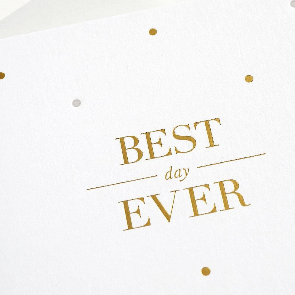 Send best wishes to the newlyweds with this beautiful Best Day Ever Wedding card. Letterpress printed in gold and silver foil. Accompanied with matching grey envelope. Folded card. Blank inside. By Sugar Paper.