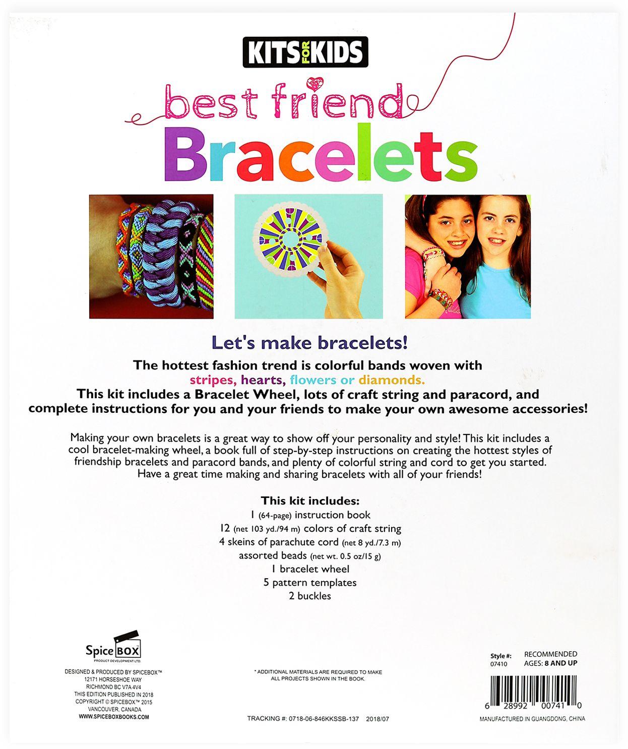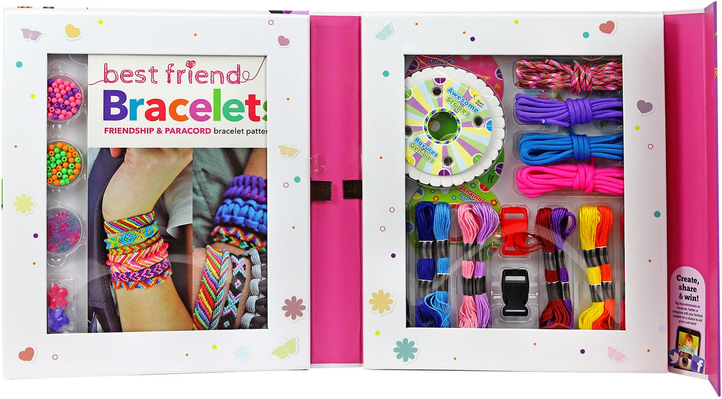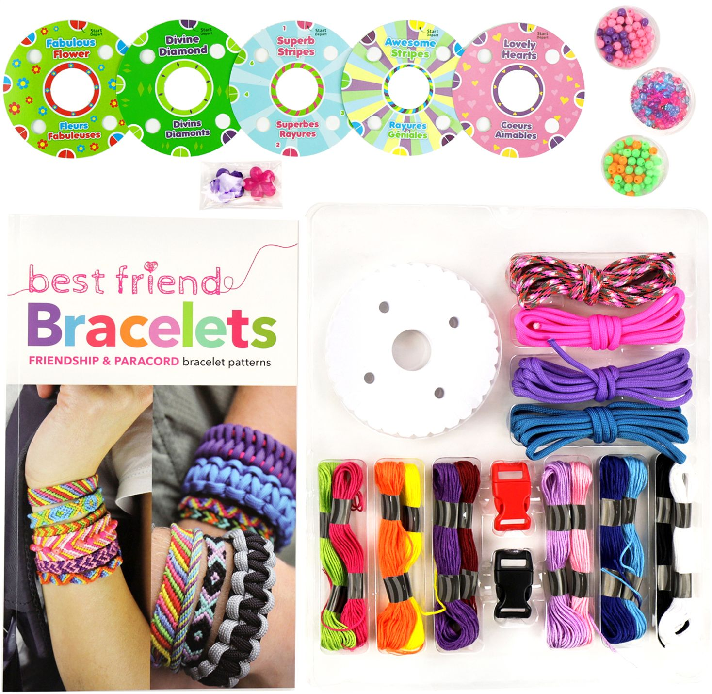 This kids Friendship Bracelet Kit comes with an easy to use wheel. making it simple and fun to quickly create stylish threaded jewelry! The hottest trend in friendship bracelets are colorful cords woven with stripes. hearts. flowers or diamonds. and you will learn all these techniques and more. The instructions are clear and simple to follow. and in no time you and your friends will be making fabulous friendship bracelets that you can wear and share.This Friendship Bracelet Kit Includes:- 1 Instruction book- 12 Colors of Craft String- 4 Skeins of Paracord – 5 Bracelet Templates & Patterns- 1 Bracelet Wheel- 4 Containers of Beads- 2 Buckles For Ages: 8+ WARNING: Choking Hazxard. Small Parts. Not For Children Under 3