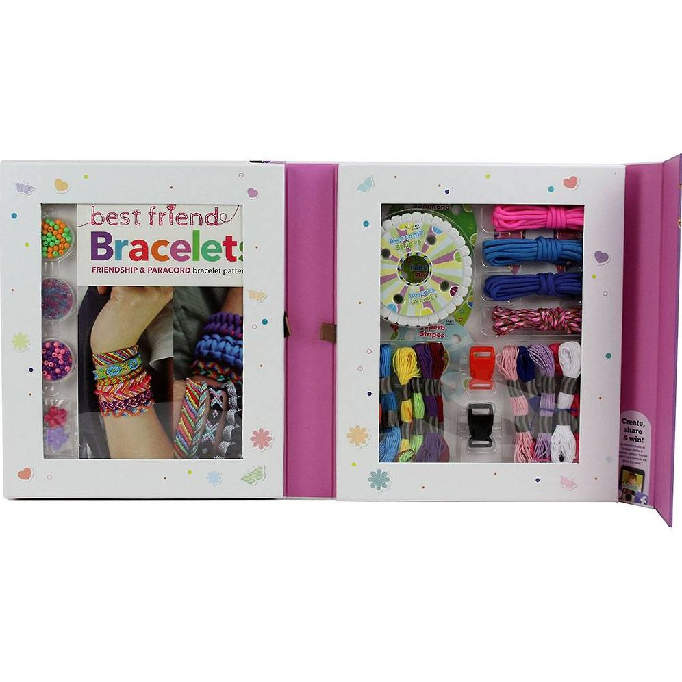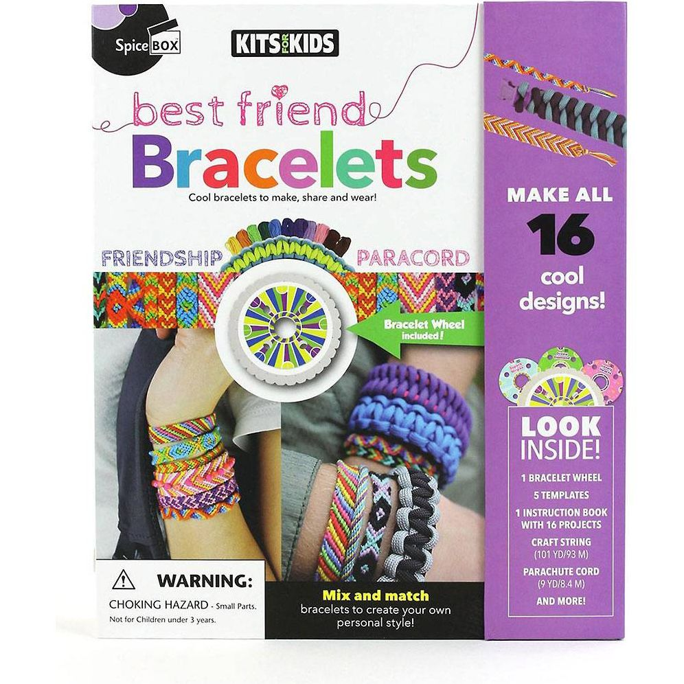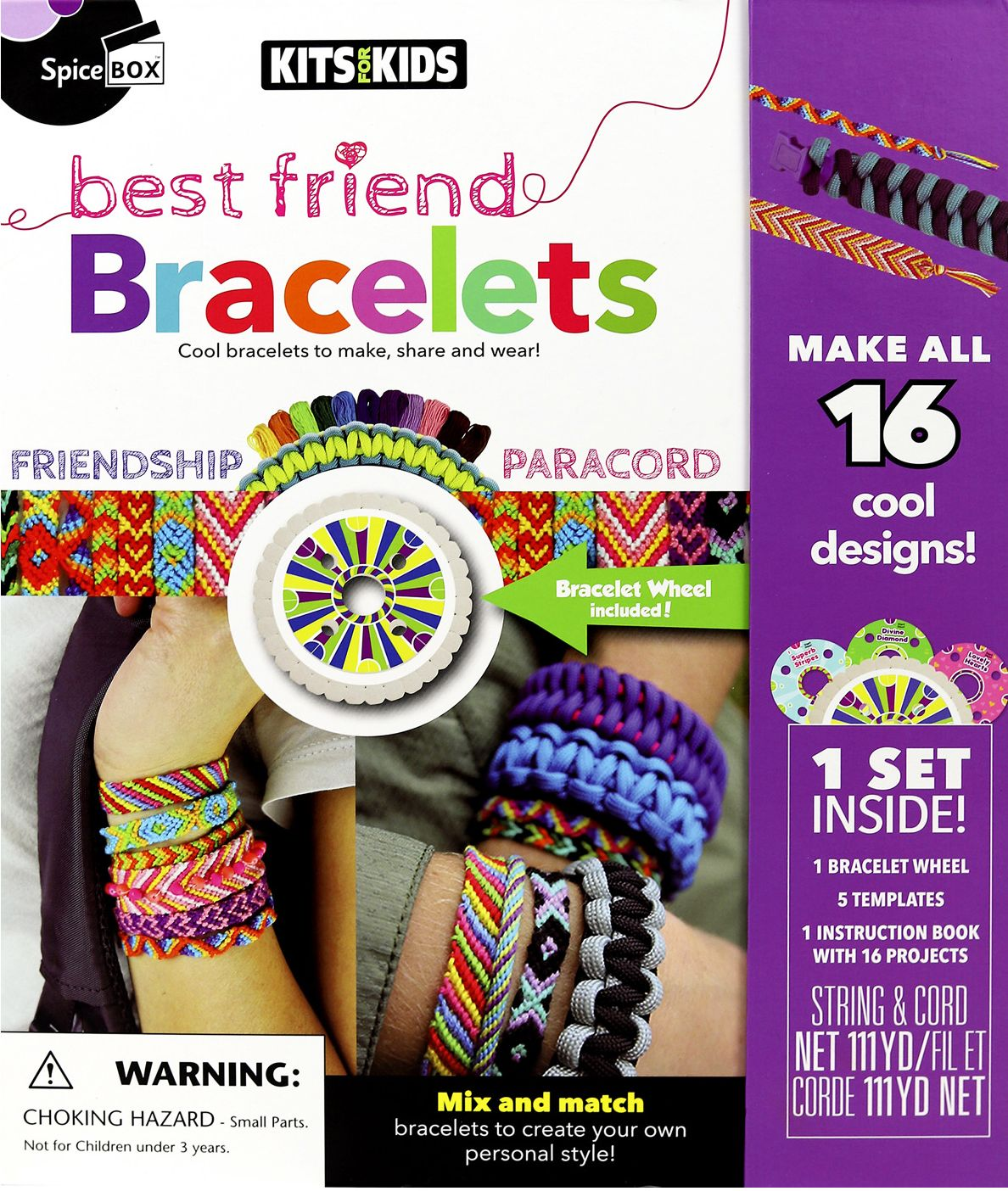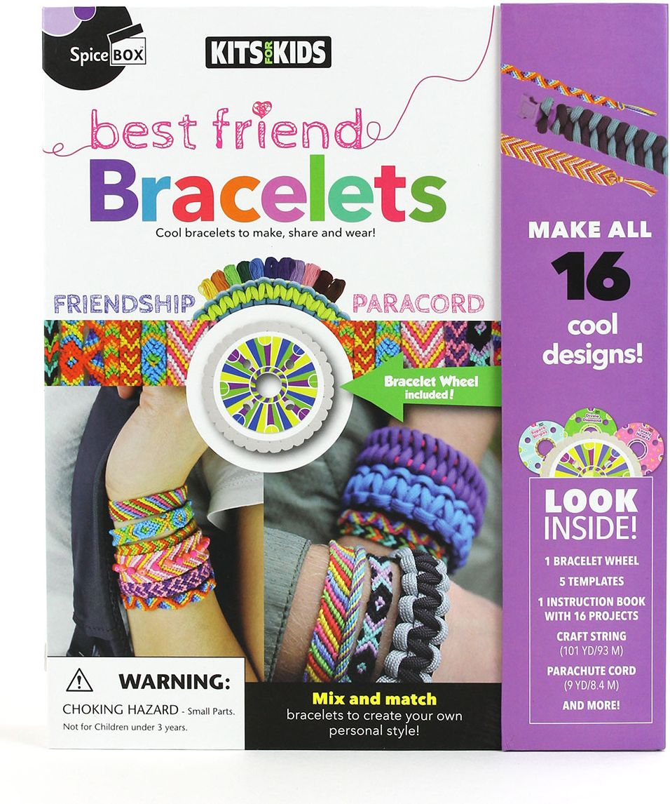 This kids Friendship Bracelet Kit comes with an easy to use wheel. making it simple and fun to quickly create stylish threaded jewelry! The hottest trend in friendship bracelets are colorful cords woven with stripes. hearts. flowers or diamonds. and you will learn all these techniques and more. The instructions are clear and simple to follow. and in no time you and your friends will be making fabulous friendship bracelets that you can wear and share.This Friendship Bracelet Kit Includes:- 1 Instruction book- 12 Colors of Craft String- 4 Skeins of Paracord – 5 Bracelet Templates & Patterns- 1 Bracelet Wheel- 4 Containers of Beads- 2 Buckles For Ages: 8+ WARNING: Choking Hazxard. Small Parts. Not For Children Under 3